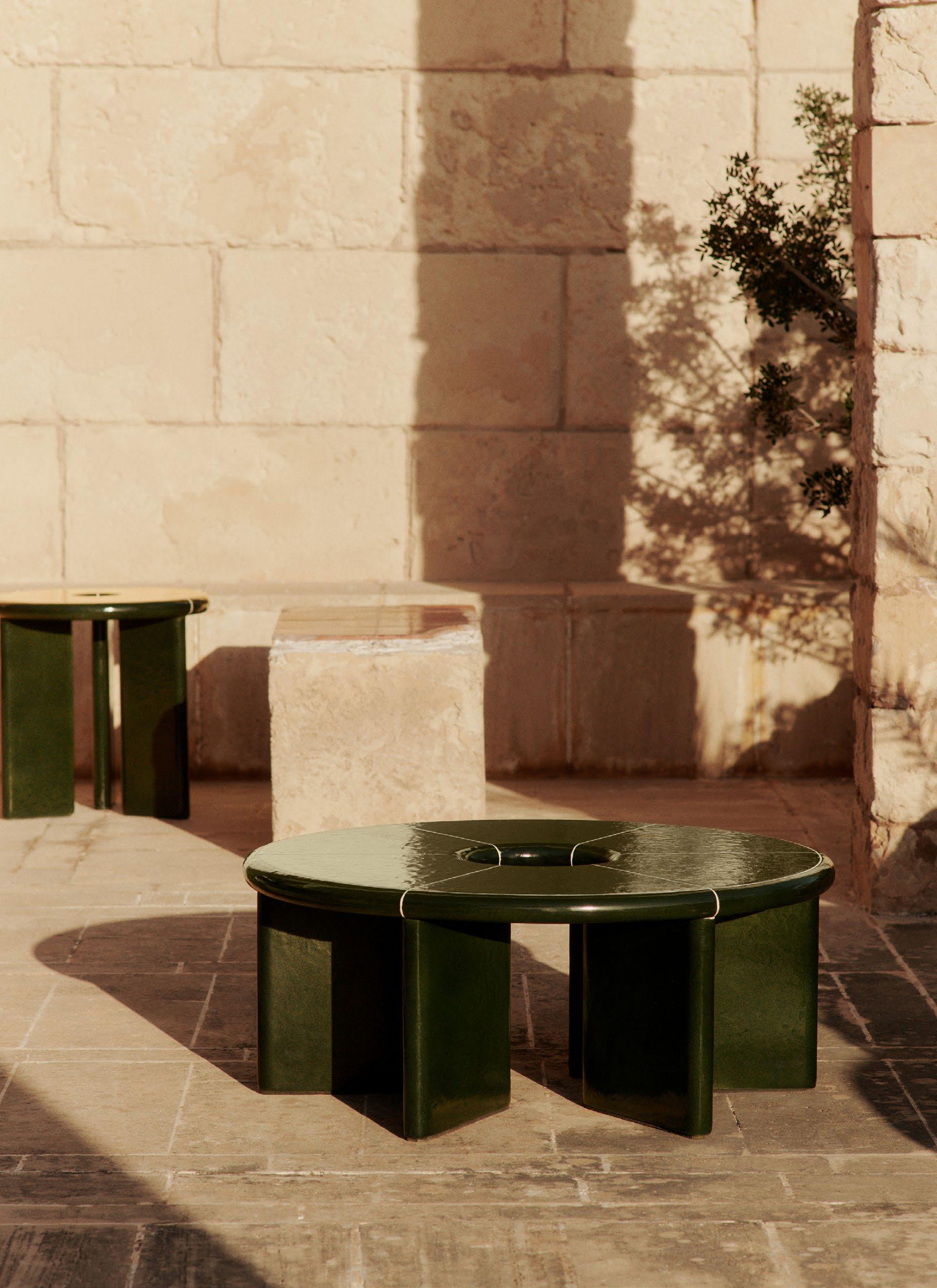 Crafted from fibre concrete, the Deya Tables showcase a striking dark green glaze with an organic, textured finish, accentuated by off-white grout lines. Their segmented tabletops create a bold geometric aesthetic, softened by generously rounded edges for a refined yet inviting presence. Balancing artisanal craftsmanship with sculptural form, these versatile tables seamlessly enhance indoor and outdoor spaces.