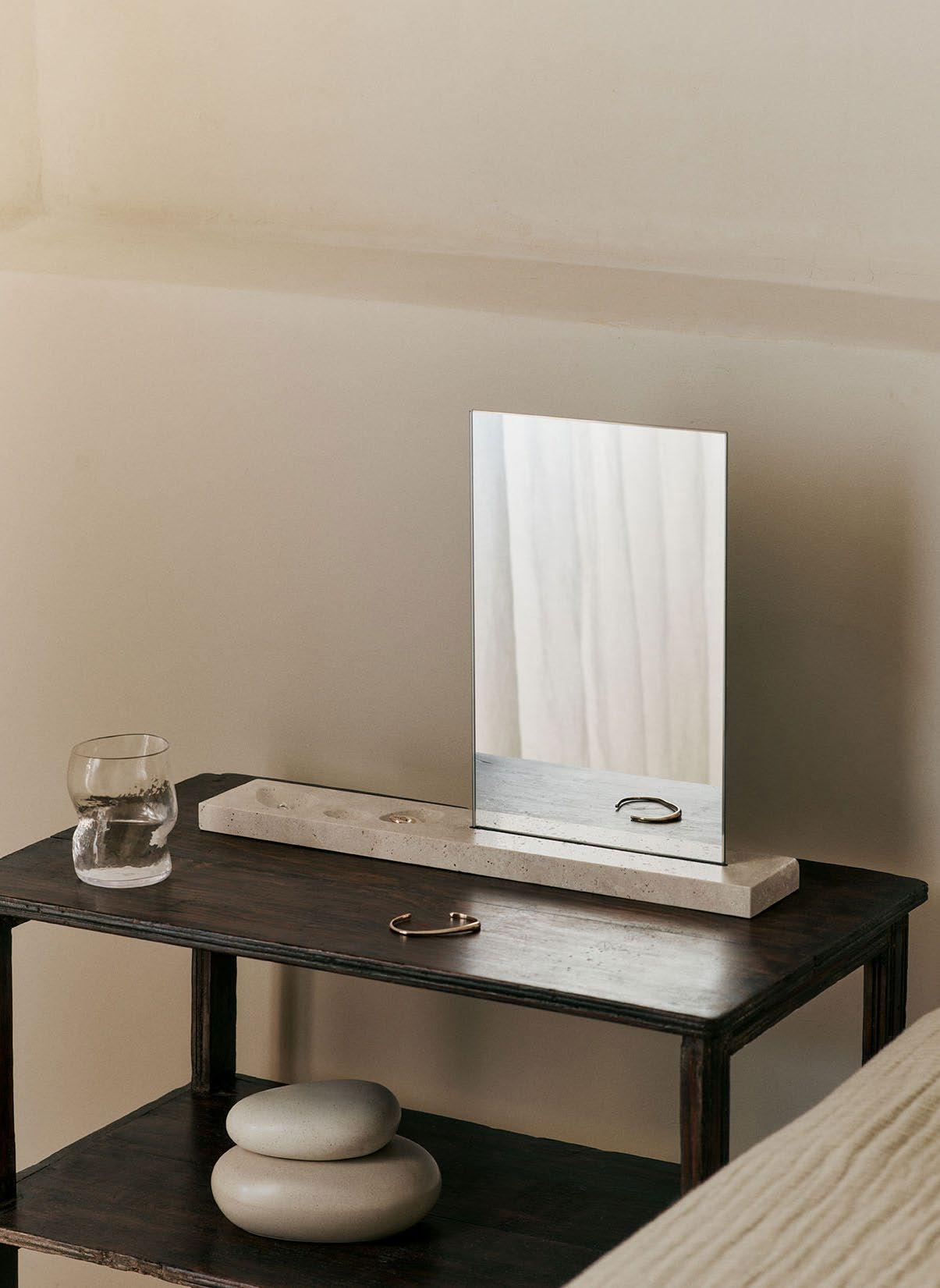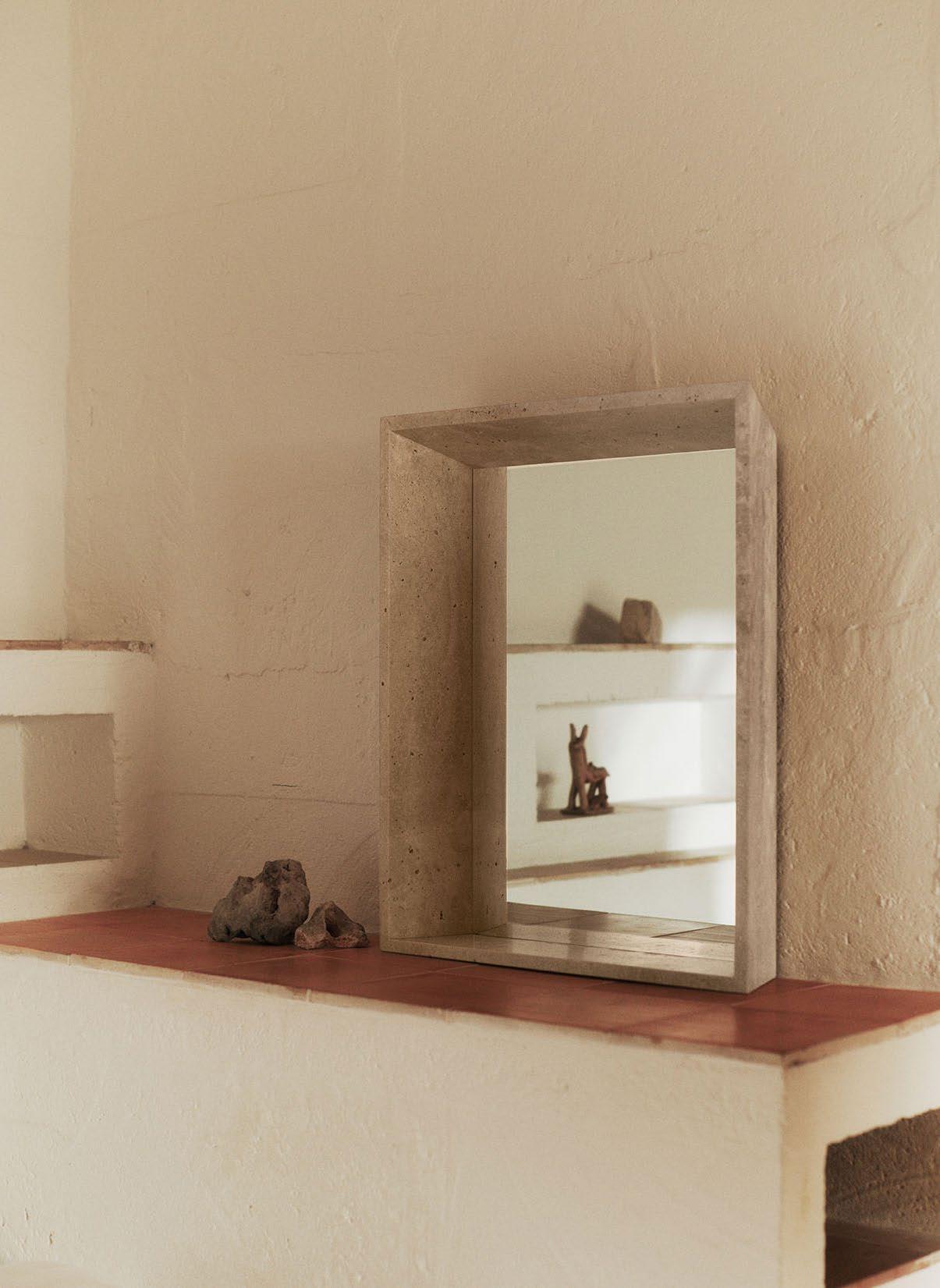 The Lancet Mirror is inspired by the narrow aperture windows of Can Lis, known for casting stunning light patterns throughout the day. Named after the pointed architectural lancet windows, the design pays homage to these forms. The mirror is crafted from travertine and glass, combining natural stone textures with sleek reflectiveness. With its architectural elegance, the Lancet Mirror serves as a striking focal point, ideal for hallways, entryways, or living spaces.
