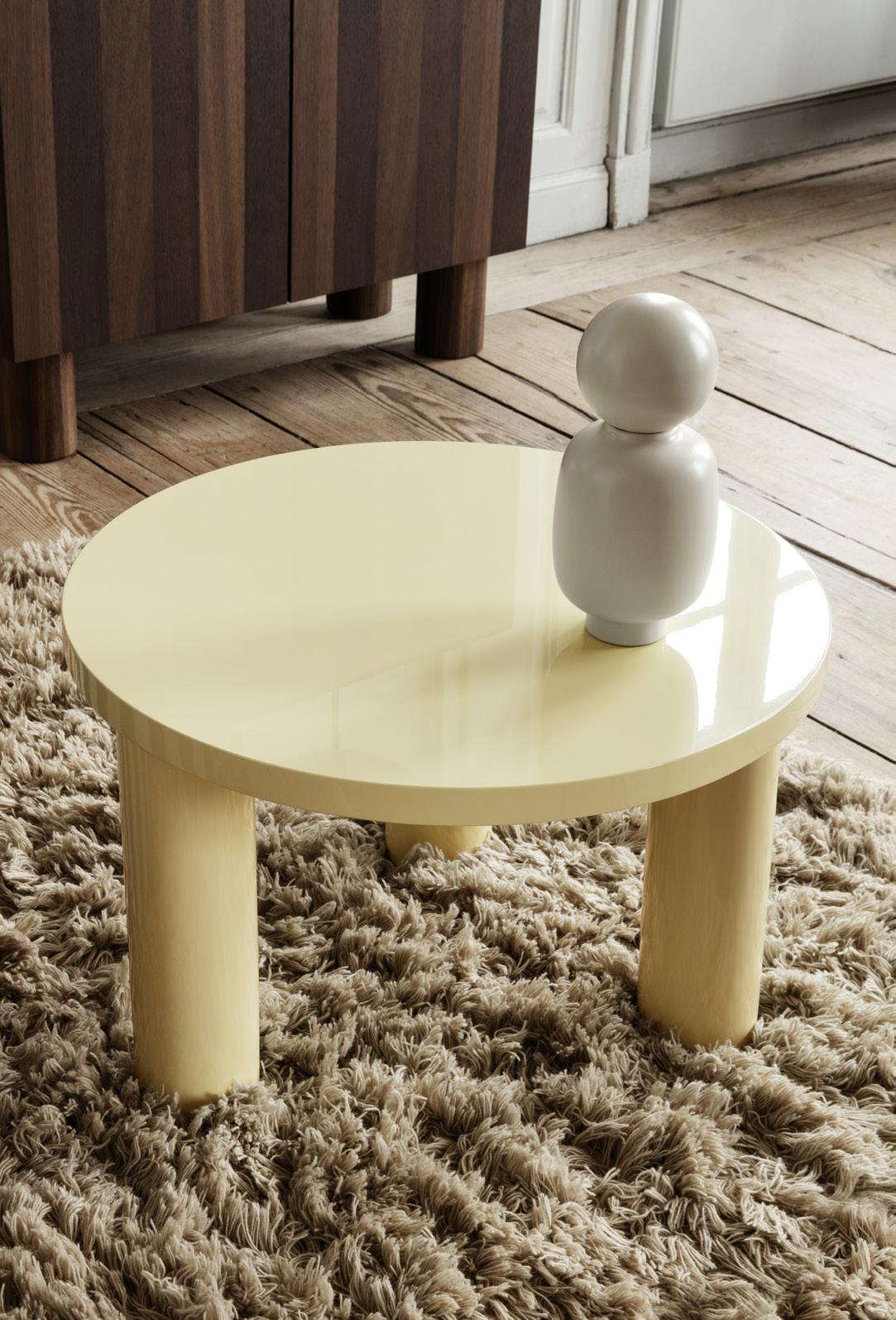 Inspired by brutalism, the Post Coffee Table plays with shapes to present a simple, round coffee table that draws you in. Made from FSC™-certified wood with a high-gloss piano lacquer, the distinctive table comes in various soft colours and has three robust cylindrical legs.