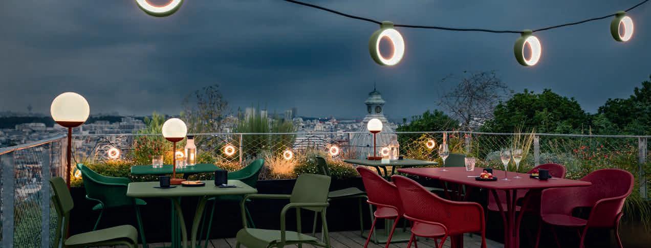 Just like its furniture, Fermob’s lighting products are practical, innovative, stylish, colourful and are made to exacting standards, from design through to production. Designed to be hung, portable, mountable, or simply placed on surfaces, Fermob lights offer a wealth of lighting scenarios and accessories for a wide range of uses and a unique user experience, adapted to each one of life’s moments!