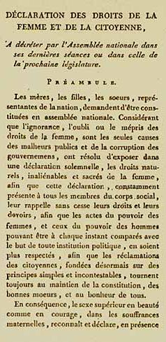 Teve início, nas últimas décadas, um movimento de retomar este discurso, compreender onde estiveram estas mulheres na produção da história. Em muitos textos1 se mencionam as mulheres que sempre existiram, mas que foram pouco ou nada reconhecidas ao longo dos acontecimentos, como, por exemplo, a escritora Olympe de Gouges, que em 1791 escreveu a “Declaração dos Direitos da Mulher e da Cidadã”, além de peças teatrais2 que explicavam os princípios da Revolução Francesa à enorme massa de analfabetos.