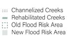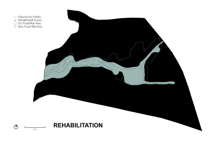 This area experiences severe flooding, with two channelized creeks running through its centre. Our design goal was to mitigate the impacts of flooding by working with water –viewing it not as a problem to be solved but as an essential and integral life-giving system to be embraced and accommodated.