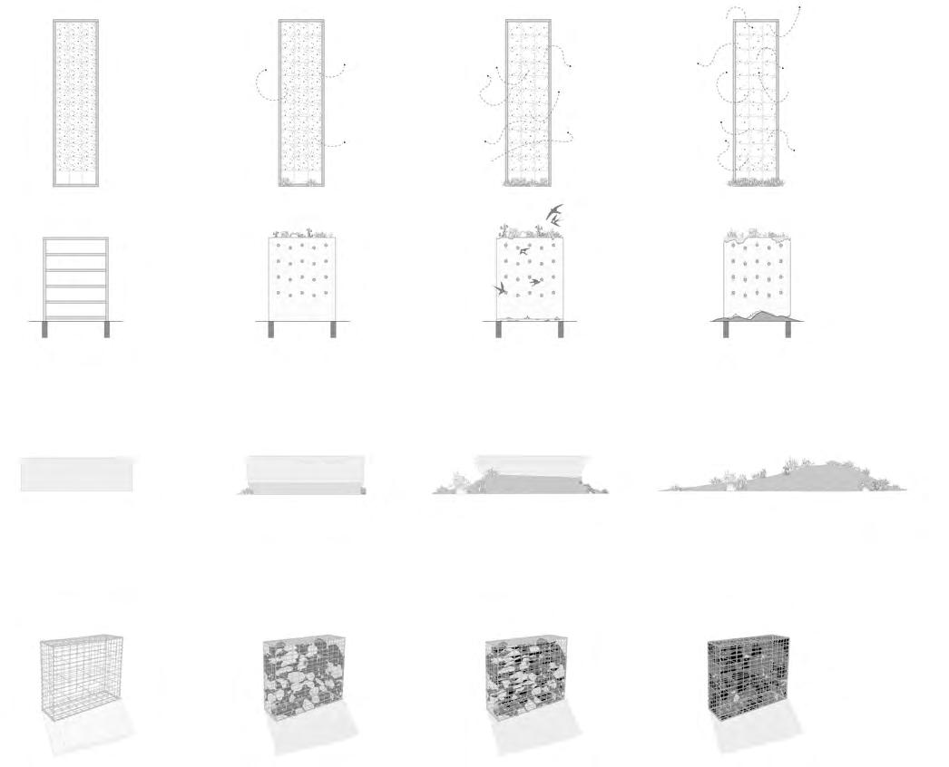 The proposed project introduces fourpanel typologies spanning various heights: Sand Pile, Timber Stack, Quarry Panel, and Nesting Wall. These columns, composed of material remnants, not only reflect past histories but also offer new potentials for the site.