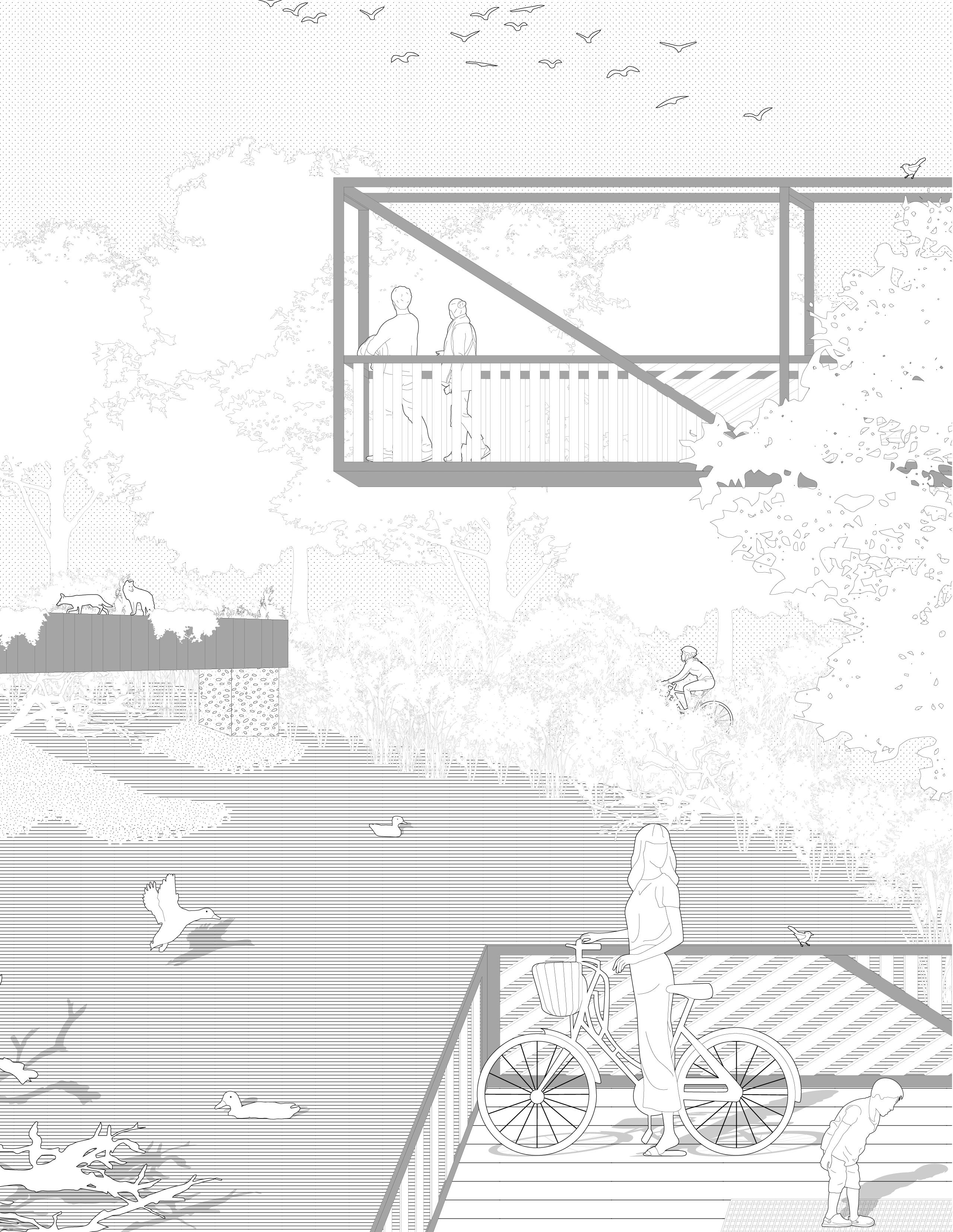 Due to those potentialities, this project aims to create an immersive experience throughout the park that connects both sides and the river visually and physically while experiencing the various conditions on the site. Paths and installations were created throughout these expanded conditions to further develop experiences.