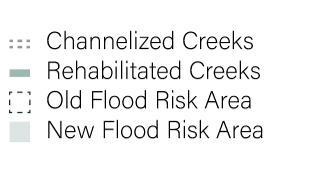 This area experiences severe flooding, with two channelized creeks running through its centre. Our design goal was to mitigate the impacts of flooding by working with water – viewing it not as a problem to be solved but as an essential and integral life-giving system to be embraced and accommodated.