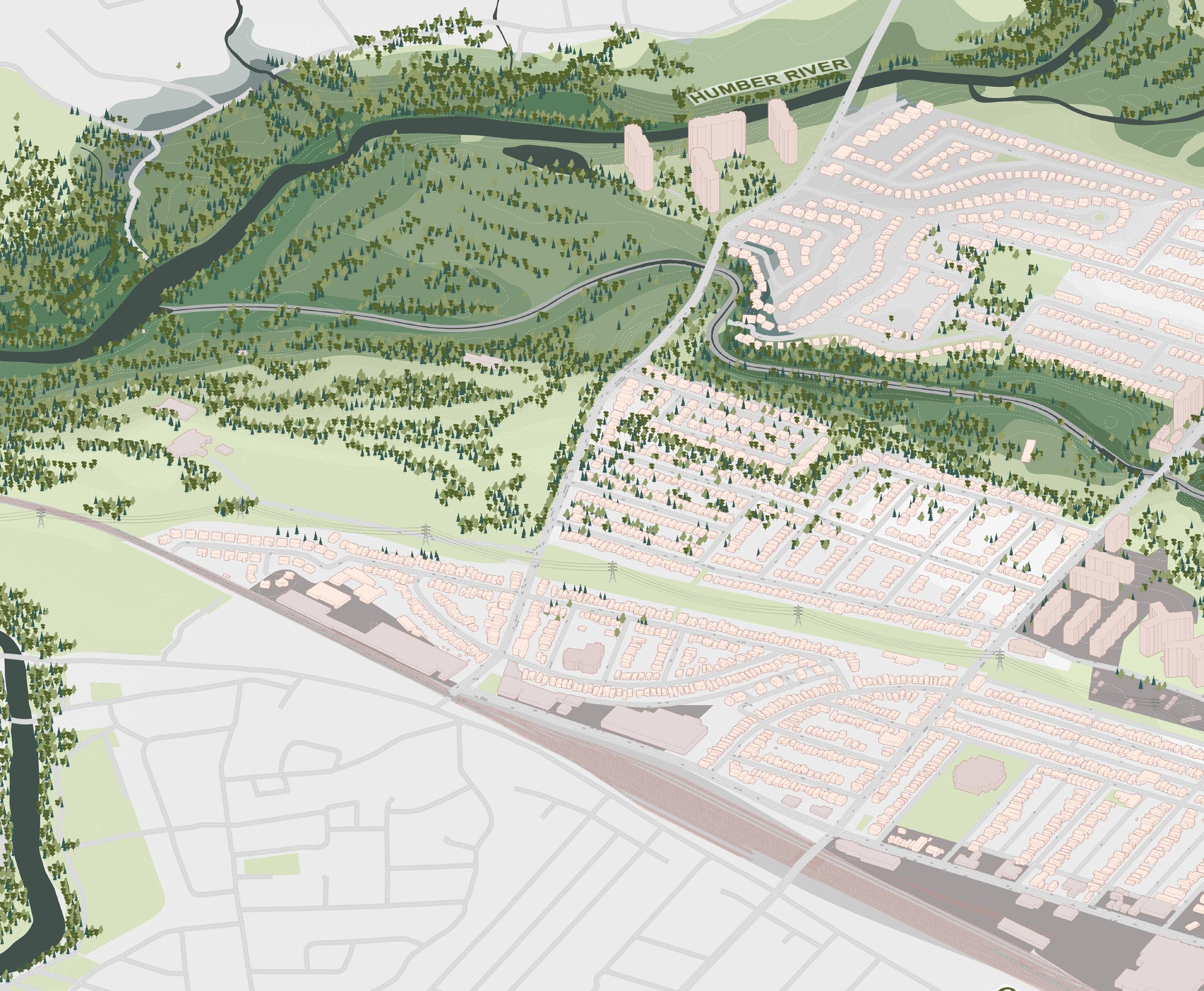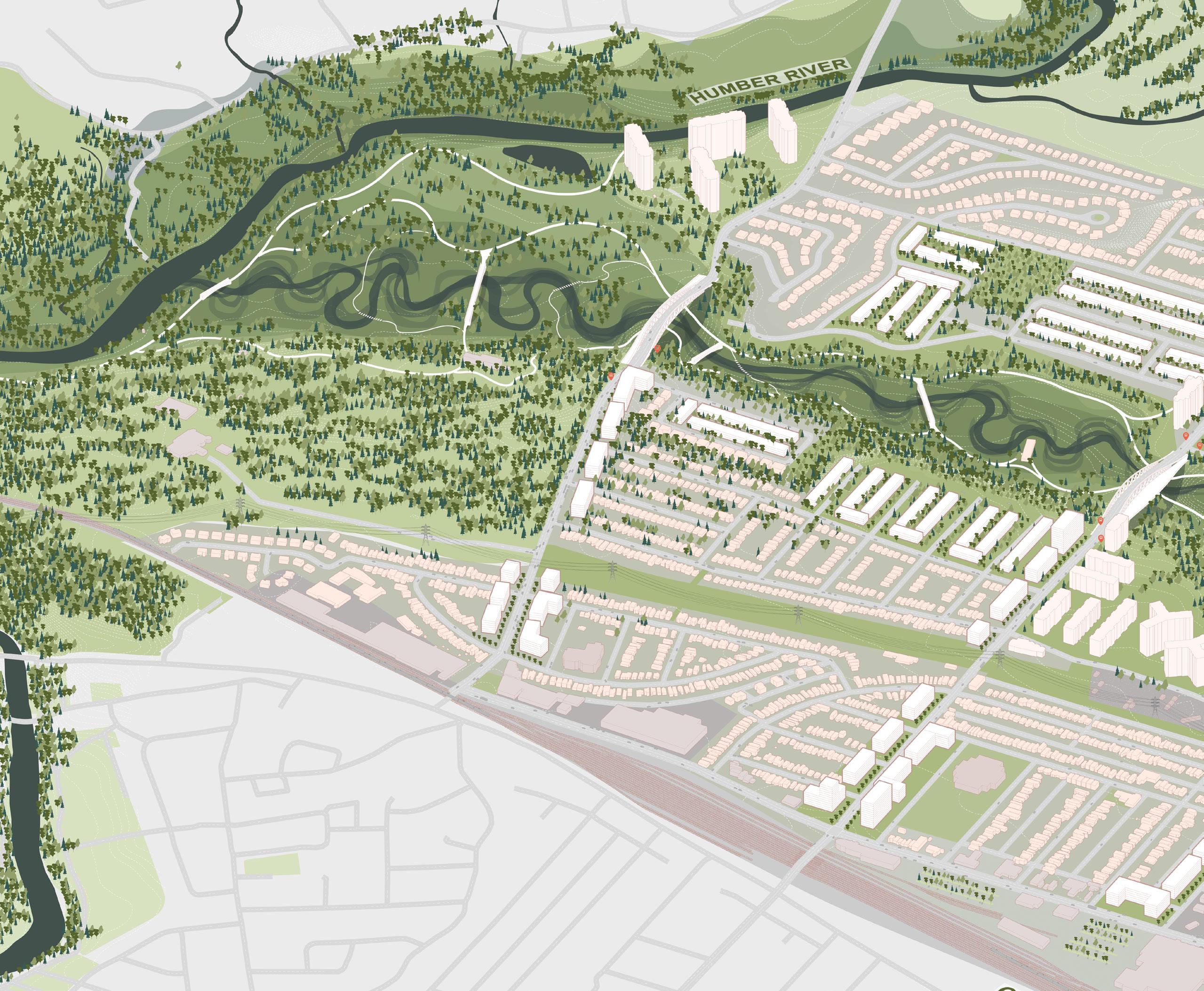 In the face of the profound changes promised by climate change, supporting the rehabilitation of the Black Creek Watershed is essential. Doing so also has the potential to turn a point of distress for the community of RockcliffeSmythe into a point of pride. By rehabilitating the river, providing a new public realm with diverse parkspace, and redefining the edge between private and public space, our proposal aims to engage and empower local residents to continue to fight for a more just approach to land use in their neighborhood.