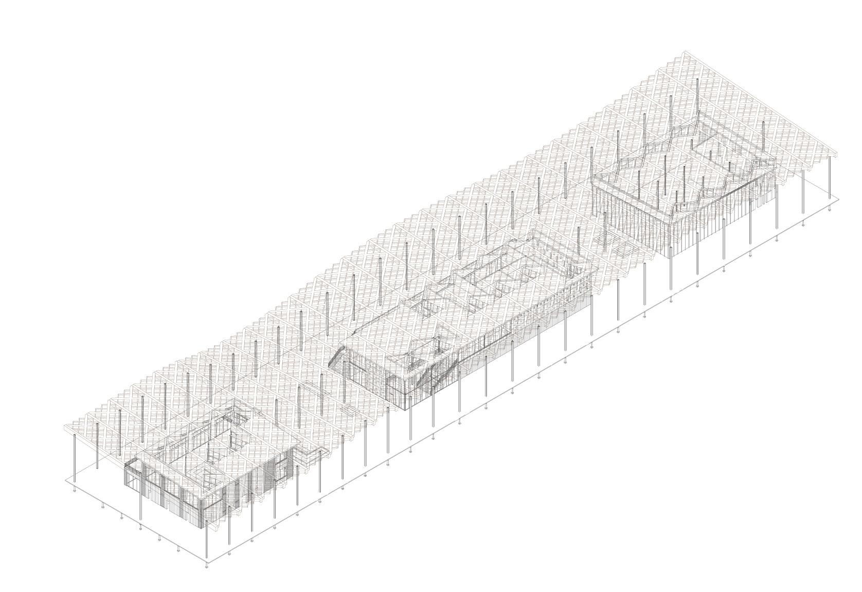 The Final Design... uses a hybrid system of Cross Laminated Timber and Cold Form Steel. The building has some rooms that the walls and columns extend to the cuved roof to create lighting inside. The curved roof is made up of glulam beams and has solar panel glass to collect sunlight to power the island.