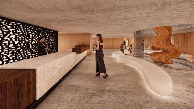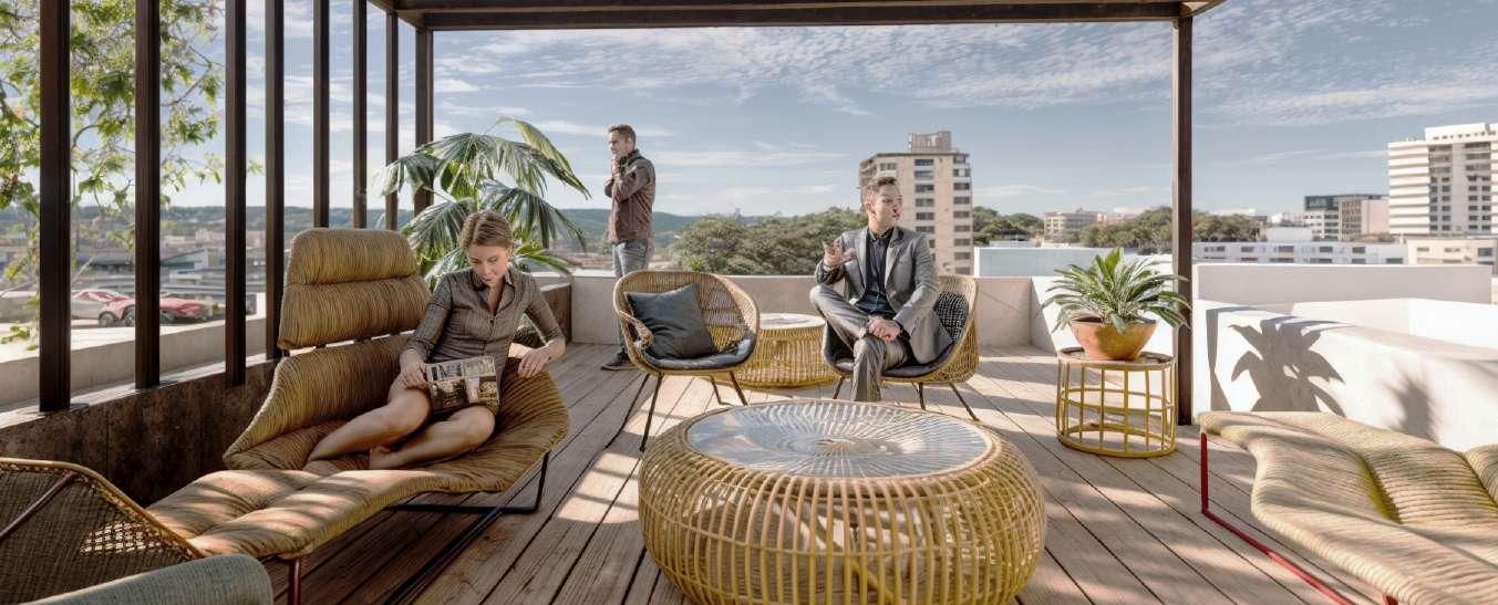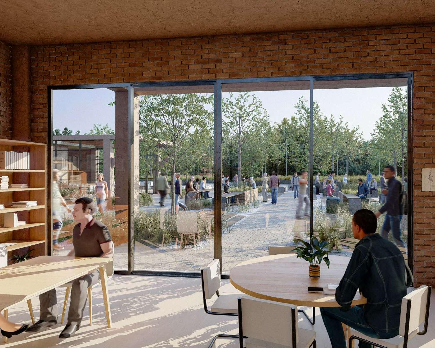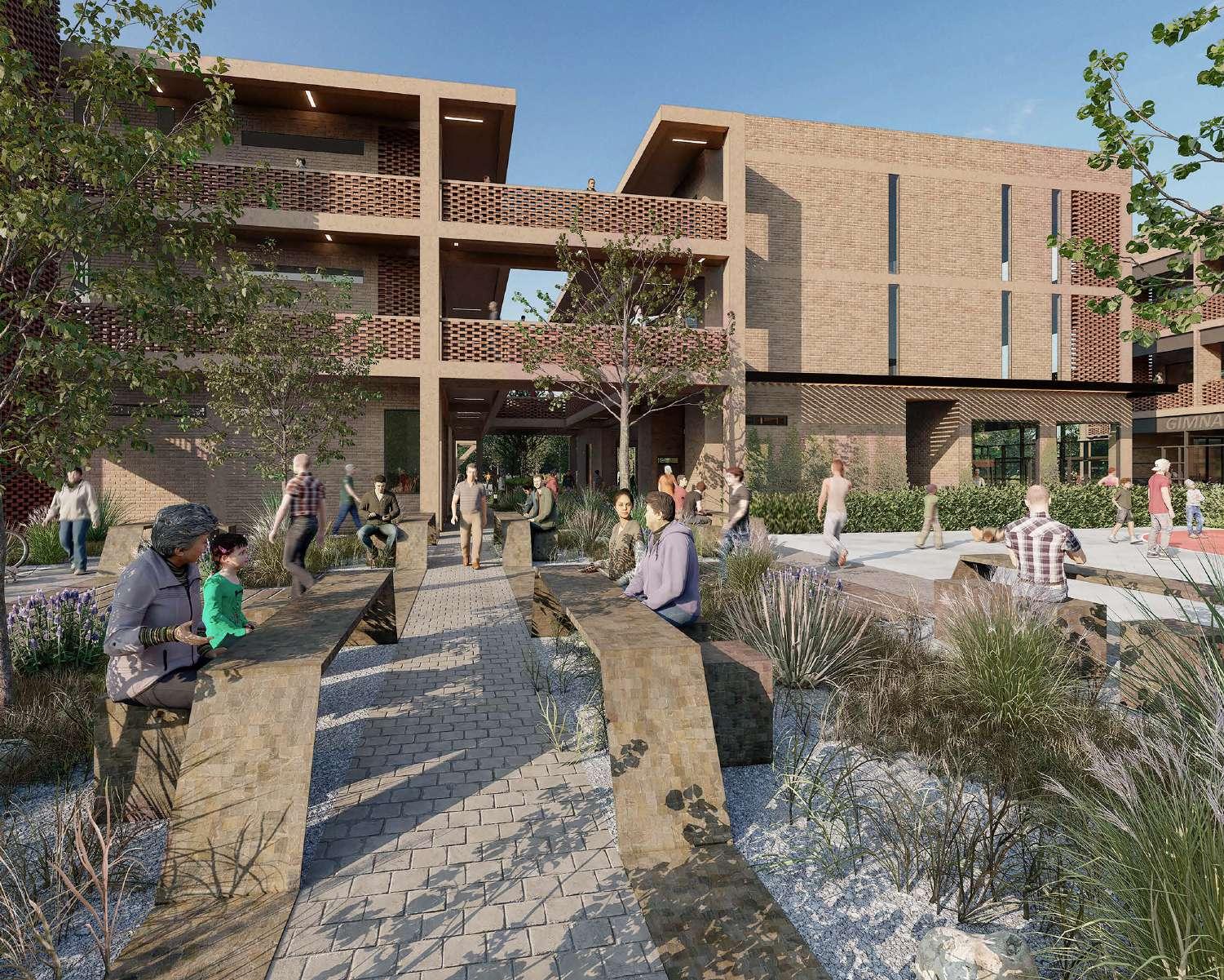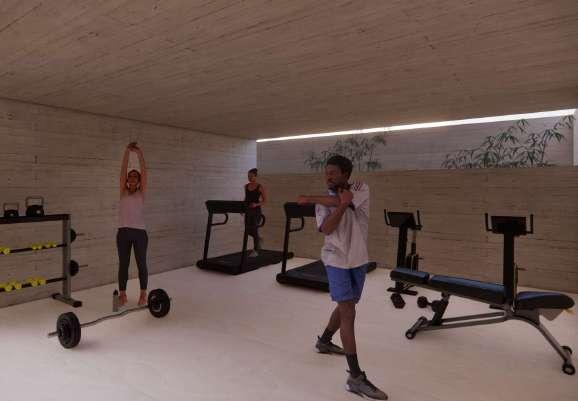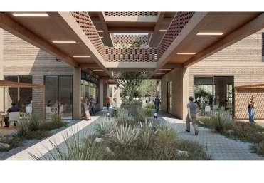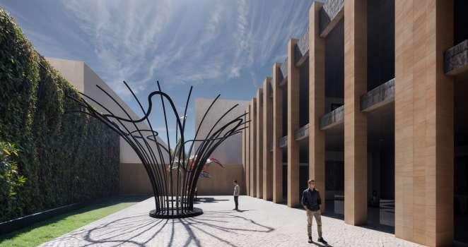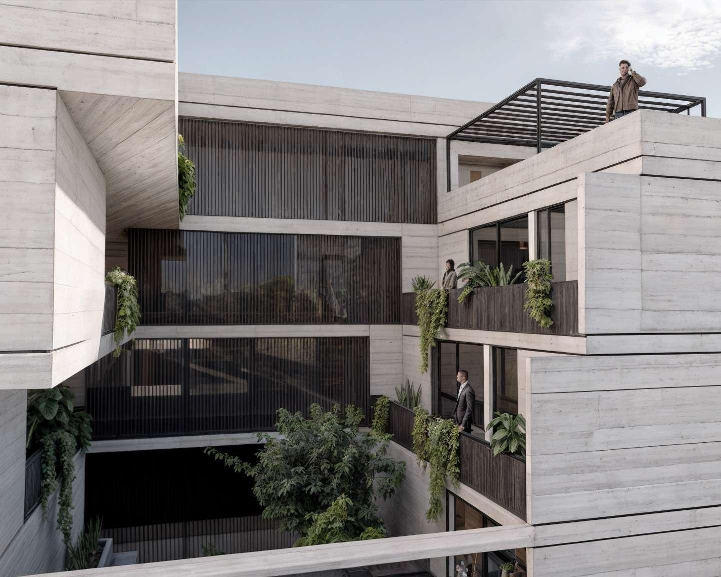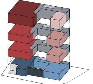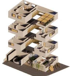 Se crea un espacio vacío diagonal orientado al este para generar sombra al patio central y ofrecer espacios abiertos en los niveles superiores.