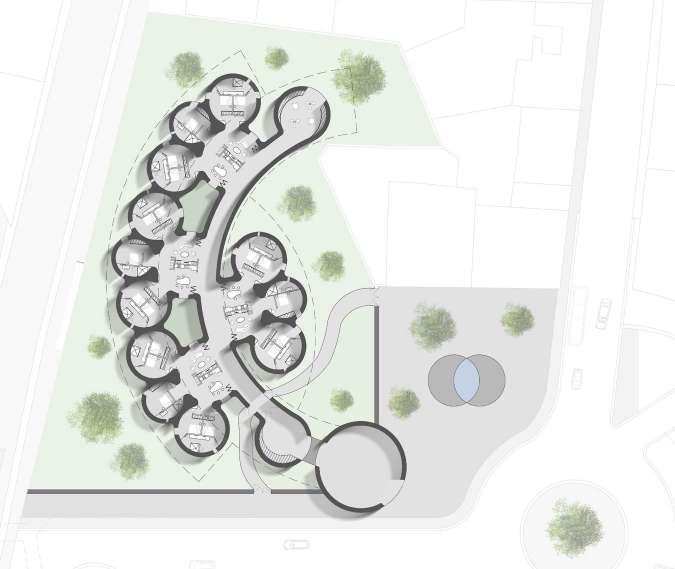 Legend 1 Pub ic entrance 2 Private entrance 3 Art gal ery 4 Art studio 5 Students room (a 6 Students room (b) 7 Bathroom 8 Common room 9 Pub ic p azza 10 Mandorla founta n FIRST FLOOR PLAN
