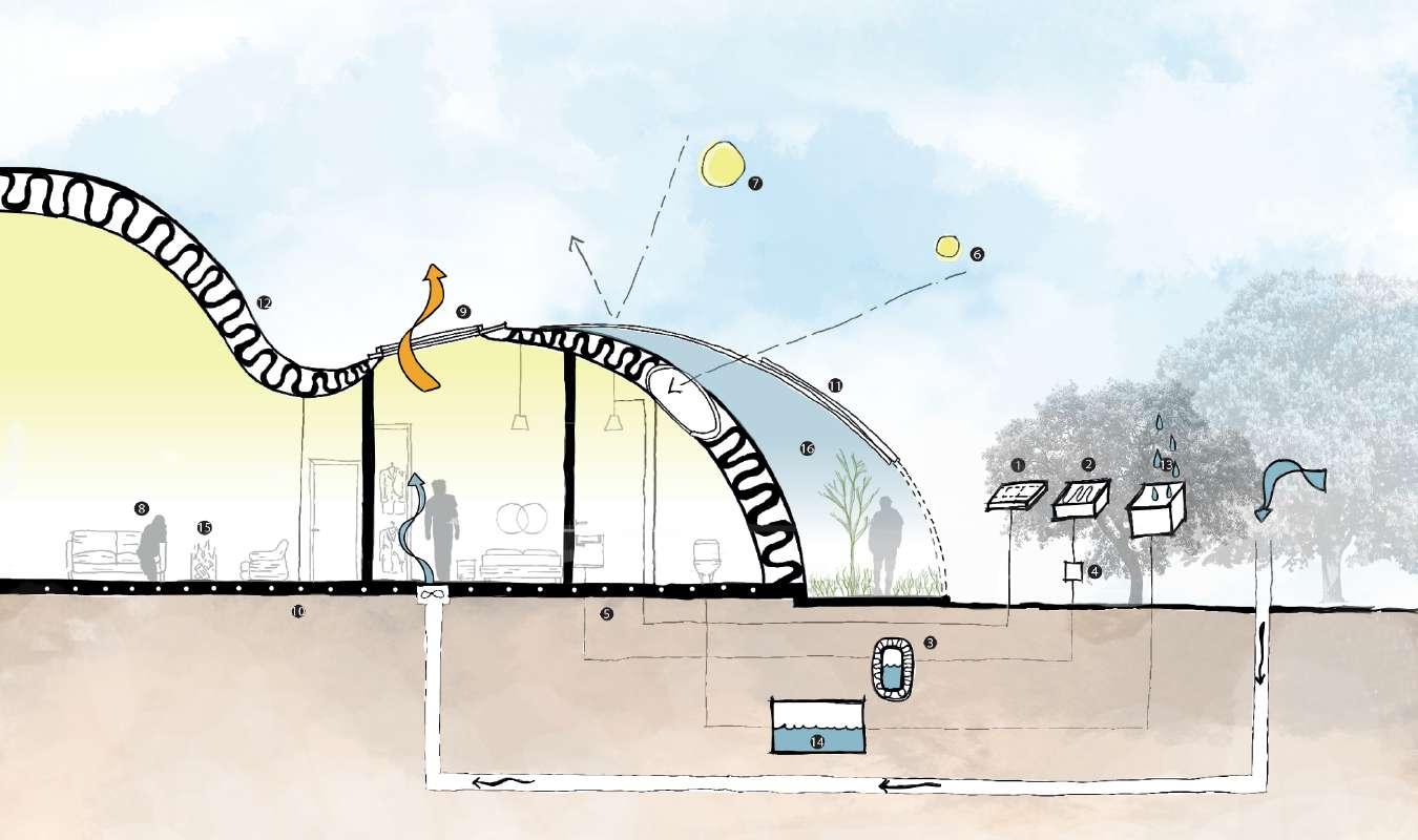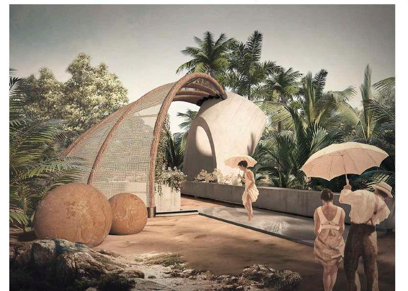 Cuidando el riego y la humedad disponemos de un pequeño estanque a modo de circuito conservando el agua original. Contamos con una media cúpula, creada con un marco de bambú como estructura, malla de fibras naturales para la luz indirecta, la forma orgánica engloba todas estas características. También tiene un espacio para las litófitas en el paso de agua original y el cilindro de hormigón. El Cilindro tiene diferentes tamaños de esferas de arcilla en el fondo, creando un momento mágico cuando llueve.