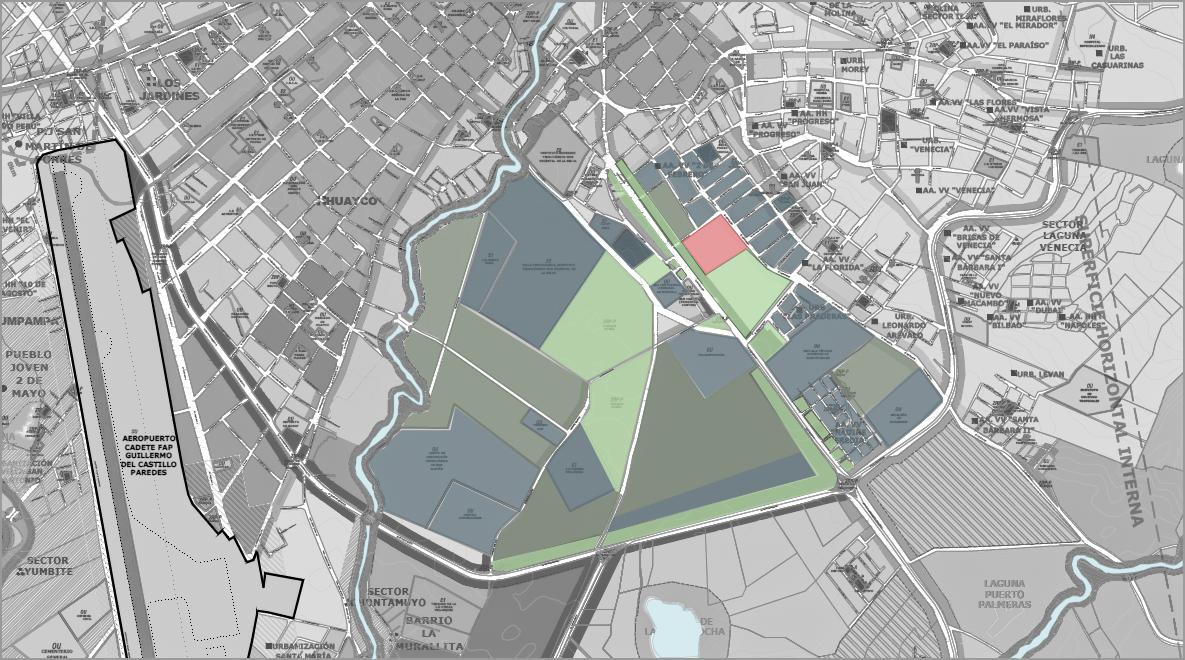 Plano indicando zonas construidas, zonas de espacios públicos y verdes.