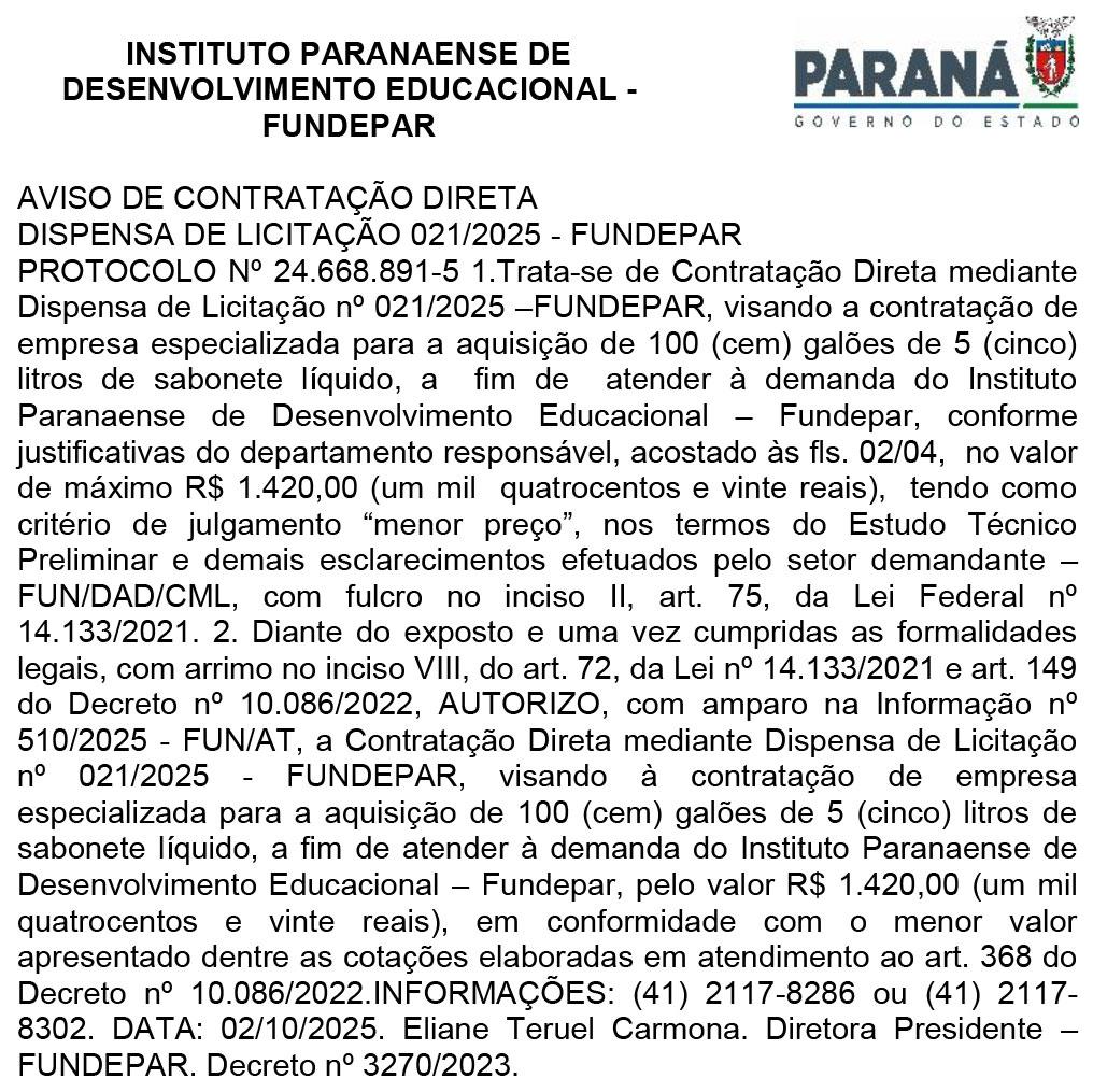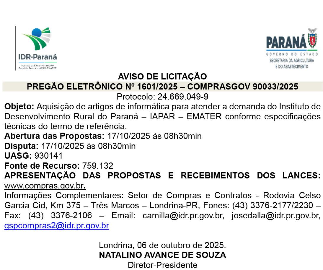 O termo de cooperação terá vigência de 60 meses, contados a partir de sua publicação oficial no Diário Oficial do Estado. Não haverá transferência de recursos financeiros entre as partes, sendo que cada uma assumirá as despesas relacionadas às ações previstas no plano de trabalho. A execução será acompanhada por gestores e fiscais designados pelo IAT e pela Prefeitura, assegurando transparência e efetividade.