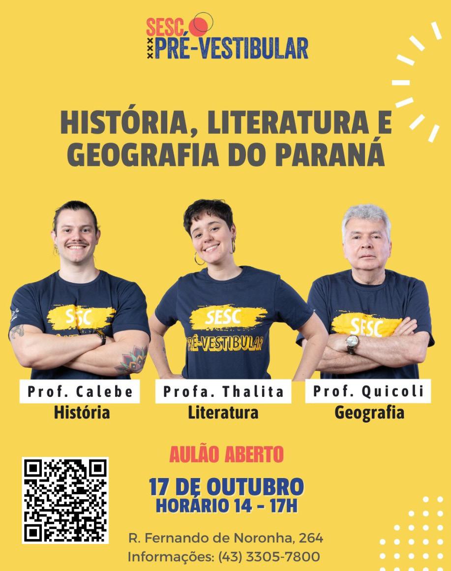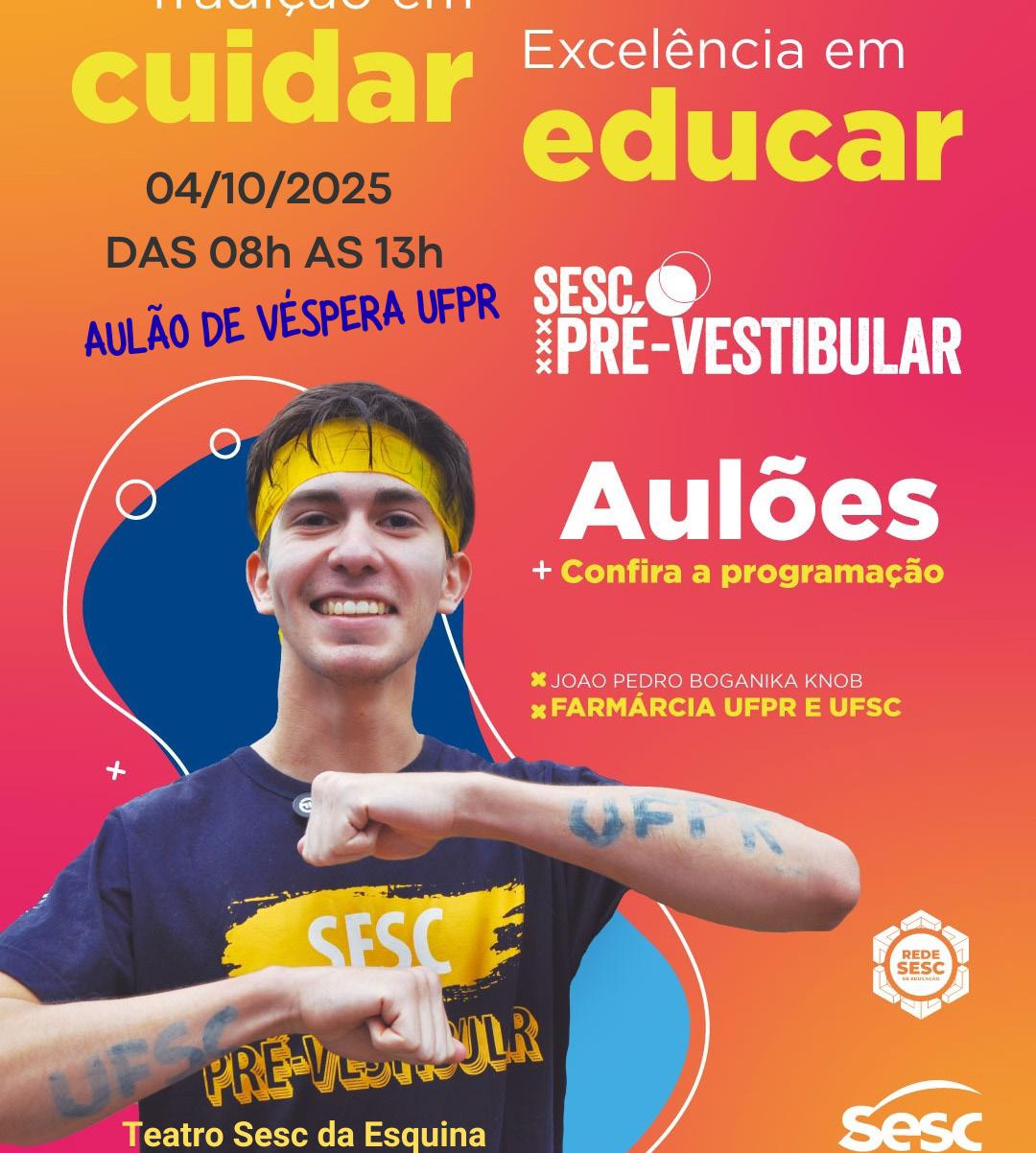 O Sesc PR realizou aulões gratuitos de véspera para auxiliar alunos na preparação para vestibulares e o Enem. Em Curitiba, no Sesc da Esquina, o primeiro encontro aconteceu no sábado, 4 de outubro, das 8h às 13h, com foco no vestibular da UFPR, no Teatro da unidade. Durante o mês, os aulões abordaram Linguagens (14/10), Exatas (18/10) e Redação e repertório (21/10) para o Enem.