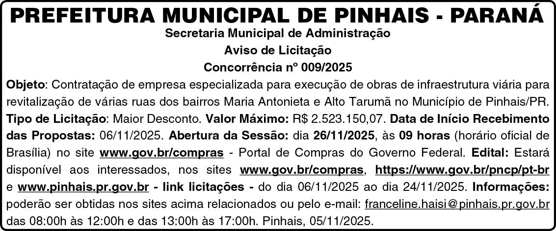 O Governo do Paraná autorizou R$ 198 milhões em novas licitações para 25 projetos em municípios de todas as regiões. A maior parte, R$ 184 milhões, será destinada à pavimentação urbana, com R$ 119 milhões para o programa Asfalto Novo, Vida Nova. Piraquara e Francisco Beltrão estão entre as cidades mais beneficiadas. CNH Social
