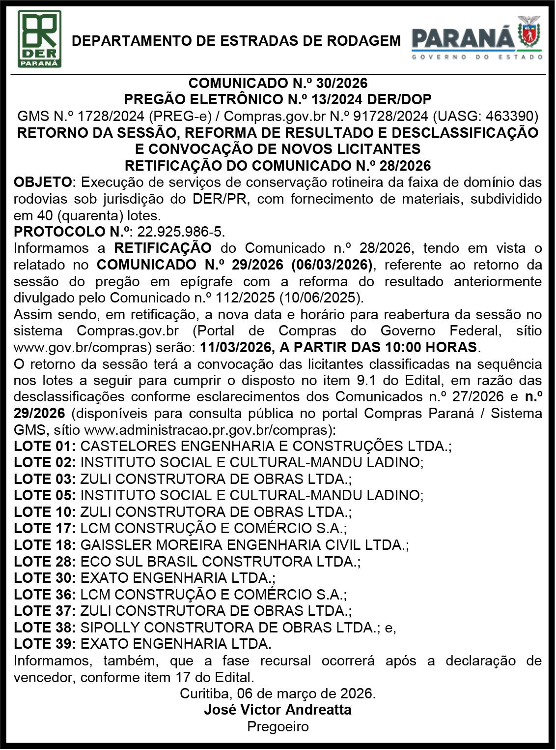 O Pregoeiro designado por meio do decreto nº 389/2023, no uso de suas atribuições legais, decide pela INTENÇÃO DE ANULAR O ITEM 12 do Pregão Eletrônico nº 096/2025 que tem por objeto o “Aquisição de recursos Lúdicos e artísticos para a Prefeitura Municipal de Pinhais”. Fica aberto o prazo de 03 (três) dias úteis aos interessados para que possam exercer a ampla defesa e o contraditório. Demais atos permanecem inalterados. Pinhais, 06/03/2026.