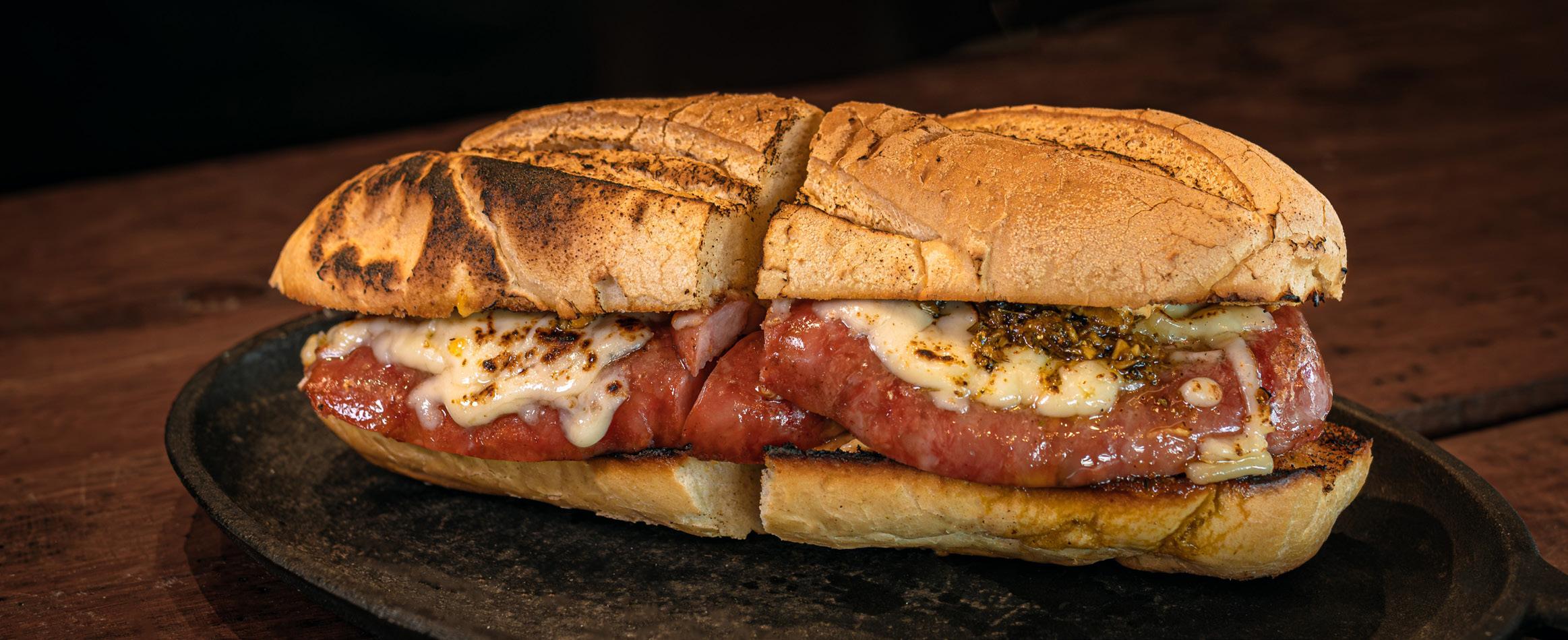 brioche, cheddar e cebola caramelizada, e o Pastrami Burguer, que combina hambúrguer de costela com pastrami desfiado, picles e maionese da casa. Outras opções são o sanduíche clássico de pastrami, servido em pão de fermentação natural com maionese de mostarda e picles artesanal, e o tradicional choripán, feito com linguiça parrillera, queijo, maionese de páprica e chimichurri da casa.
