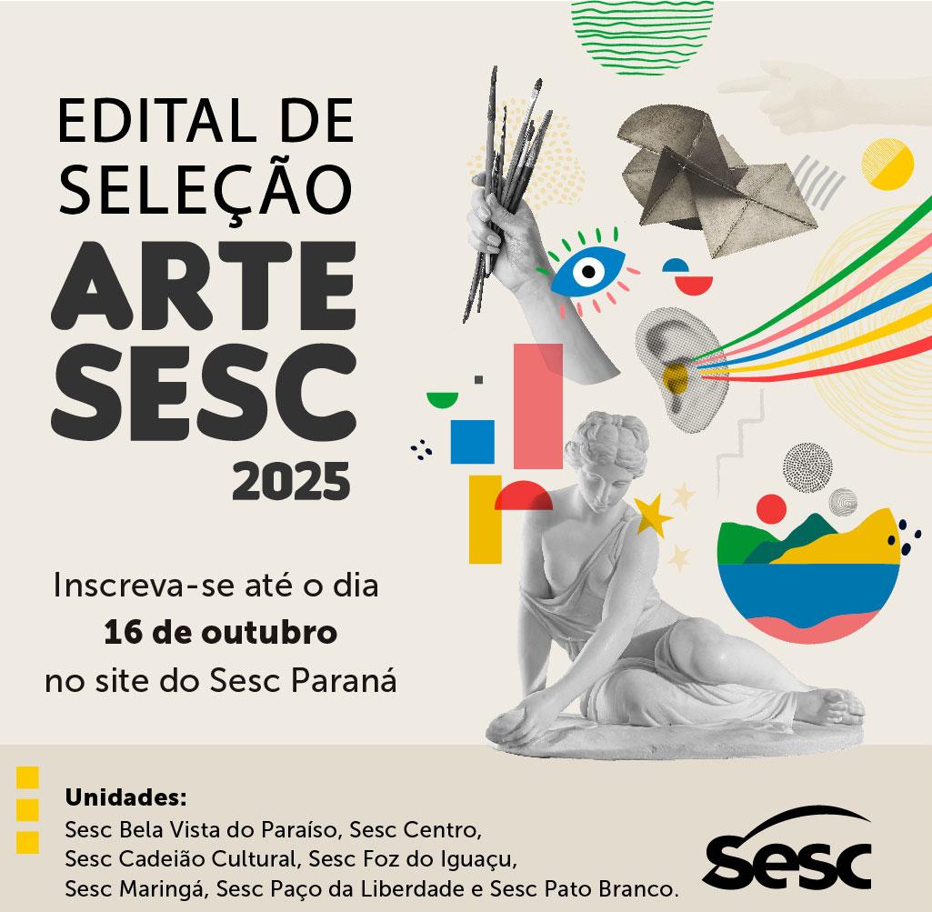 Para promover espaços para exposição de trabalhos autorais e a oportunidade ao público de conhecer, apreciar e desfrutar da pluralidade artística nacional, o projeto ArteSesc recebe até o dia 16 de outubro propostas de artistas visuais de todo o Brasil para exposições de artes visuais em sete galerias do Sesc Paraná, para o ano de 2025, nas cidades de Bela Vista do Paraíso, Curitiba, Foz do Iguaçu, Londrina, Maringá e Pato Branco. Até 40 propostas com classificação livre, individual, coletiva ou de curadoria serão selecionadas e comporão a agenda de programação das unidades do Sesc PR no próximo ano. De acordo com o edital, cada proposta selecionada deverá contemplar, além da exposição, um bate-papo presencial com o público, outro online com as equipes das unidades e uma oficina de artes visuais.