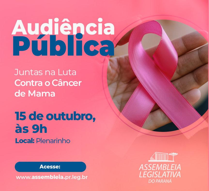 A Assembleia Legislativa do Paraná promove no próximo dia 15 de outubro, às 9 horas, no Plenarinho, a Audiência Pública “Juntas na Luta Contra o Câncer de Mama“. O encontro é promovido por proposição da presidente da Comissão de Defesa dos Direitos da Mulher, deputada Cantora Mara Lima (Republicanos), e da procuradora especial da Mulher na Assembleis, deputada Cloara Pinheiro (PSD). O evento vai reunir médicos, especialistas, representantes do Governo, do Ministério Público e de instituições que apoiam e dão suporte às pacientes com câncer e suas famílias.