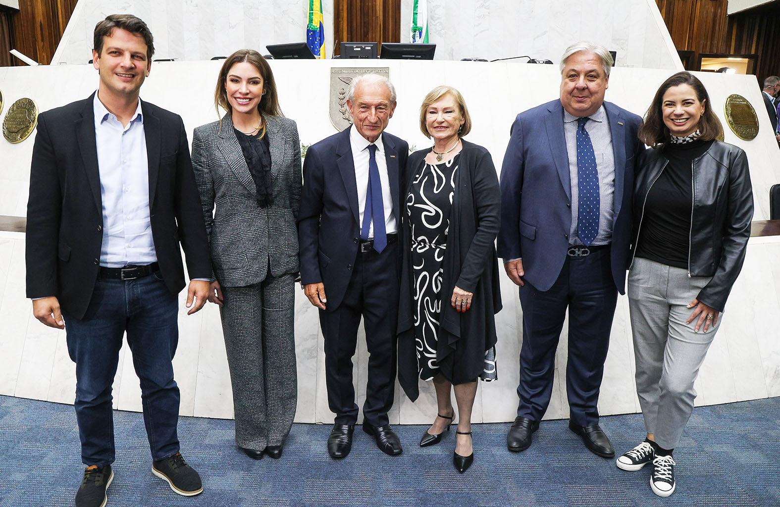 Prefeito Eduardo Pimentel com a deputada estadual Maria Victoria, e o presidente da ACP, Antonio Gilberto Deggerone, homenageado com o título de Cidadão Honorário do Estado do Paraná, na Assembleia Legislativa