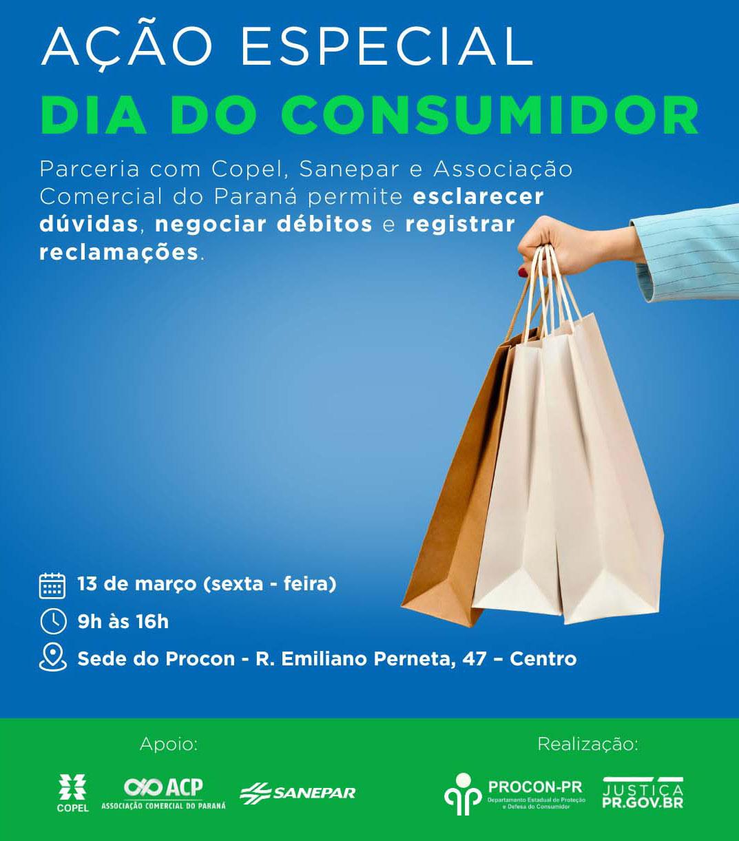 A iniciativa reúne Copel, Sanepar e a Associação Comercial do Paraná (ACP). Das 9h às 16h de sexta-feira (13), os consumidores poderão esclarecer dúvidas, receber orientações e formalizar reclamações diretamente com representantes das instituições participantes. O atendimento será realizado na sede do ProconPR em Curitiba. Em celebração ao Dia Internacional do Consumidor, a Secretaria de Estado da Justiça e Cidadania (Seju), por meio do Procon-PR, promove nesta sexta-feira (13) uma ação especial de atendimento voltada à população. A iniciativa reúne parceria com a Copel, Sanepar e a Associação Comercial do Paraná (ACP). Das 9h às 16h, os consumidores poderão esclarecer dúvidas, receber orientações e formalizar reclamações diretamente com representantes das instituições participantes. O atendimento será realizado na sede do Procon-PR, localizada na Rua Emiliano Perneta, 47, no Centro de Curitiba.