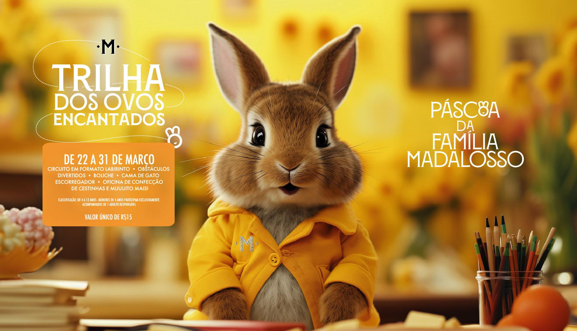 As crianças terão um novo lugar para se divertir e brincar nesta Páscoa. A Família Madalosso promoverá a Trilha dos Ovos Encantados, um circuito infantil em forma de labirinto com obstáculos, como boliche, uma oficina de customização de cestinhas de Páscoa e caça aos ovos, em um cenário instagramável, com elementos temáticos e a presença do Sr. e Sra. Coelho.