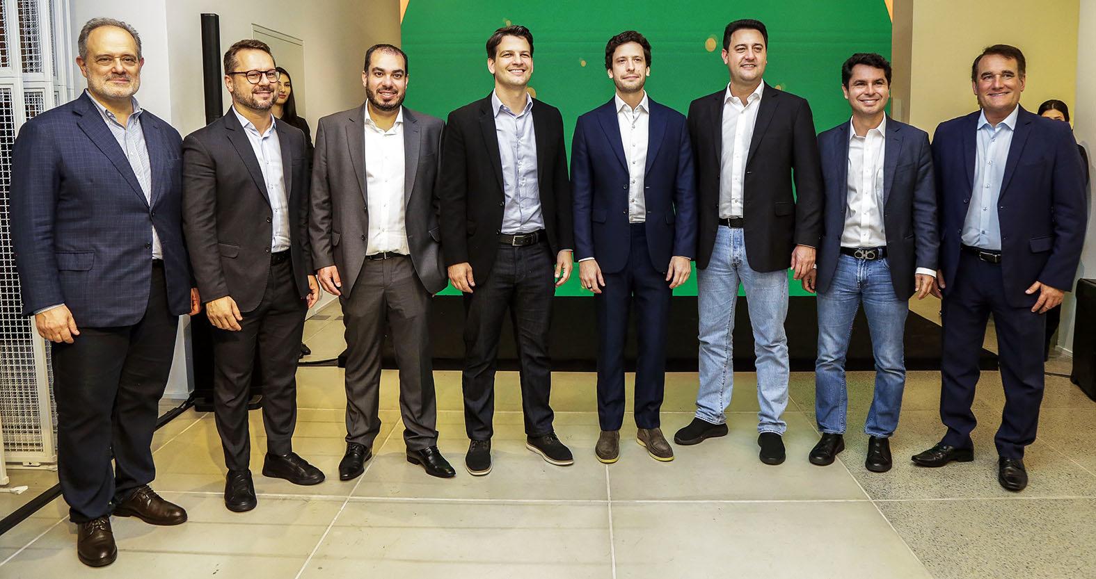 Prefeito Eduardo Pimentel com o governador Carlos Massa Ratinho Junior, e João Pedro Funaro Camargo, no lançamento do Hub de Conteúdo TMC