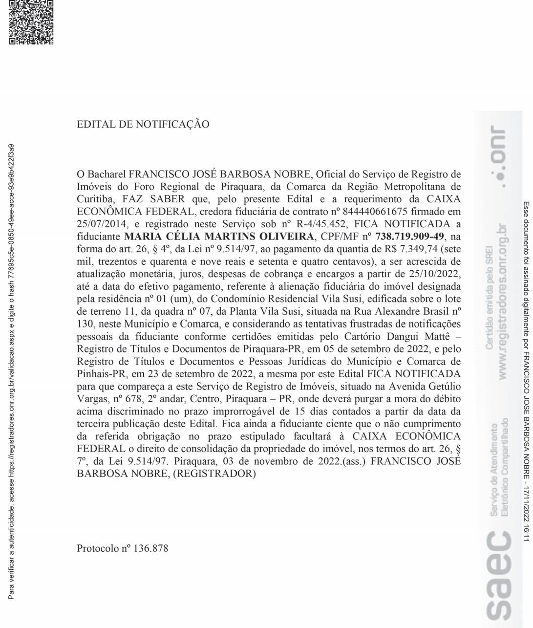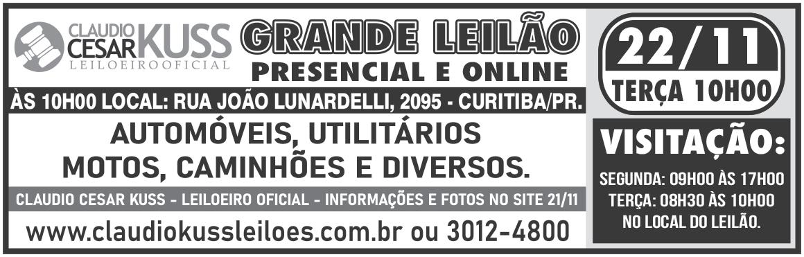 CURITIBA / PR - EDITAL CENTER LTDA CNPJ nº 04.150.383/0001-35 Diretor Comercial: Maurício Mosson Rua Amintas de Barros, 164 – Centro/Conj 46 – CEP 80.060-205 Fones: (41) 3024-6766 - Email: cial@ctbametropole.com.br SÃO JOSÉ DOS PINHAIS / PR - Fones: (41) 3383-6650 Departamento Comercial / Administrativo Email: adm.metropole@hotmail.com Contato Redação: e-mail: lustosa18@gmail.com - lustosa@onda.com.br xilus1951@outlook.com Filiado: Sindicato das Empresas de Jornais e Revistas do Estado do Paraná Filiado a ADI – PR – Associação dos Diários do Interior Representante em Santa Catarina, Paraná, São Paulo, Rio de Janeiro e Brasília: Central e Comunicação – SCS – QD 02 Bl. D/Salas 1002/1003 – Edif. Oscar Niemeyer CEP 70.316-900 – Brasília – Distrito Federal Fones: (41) 3323-4071 – (41) 98133-3400 As matérias opinativas que venham assinadas, não expressam necessariamente a opinião do jornal 2 | Sexta-feira, 18 de Novembro de 2022 | Edição 5595 | PUBLICAÇÕES LEGAIS / NACIONAL