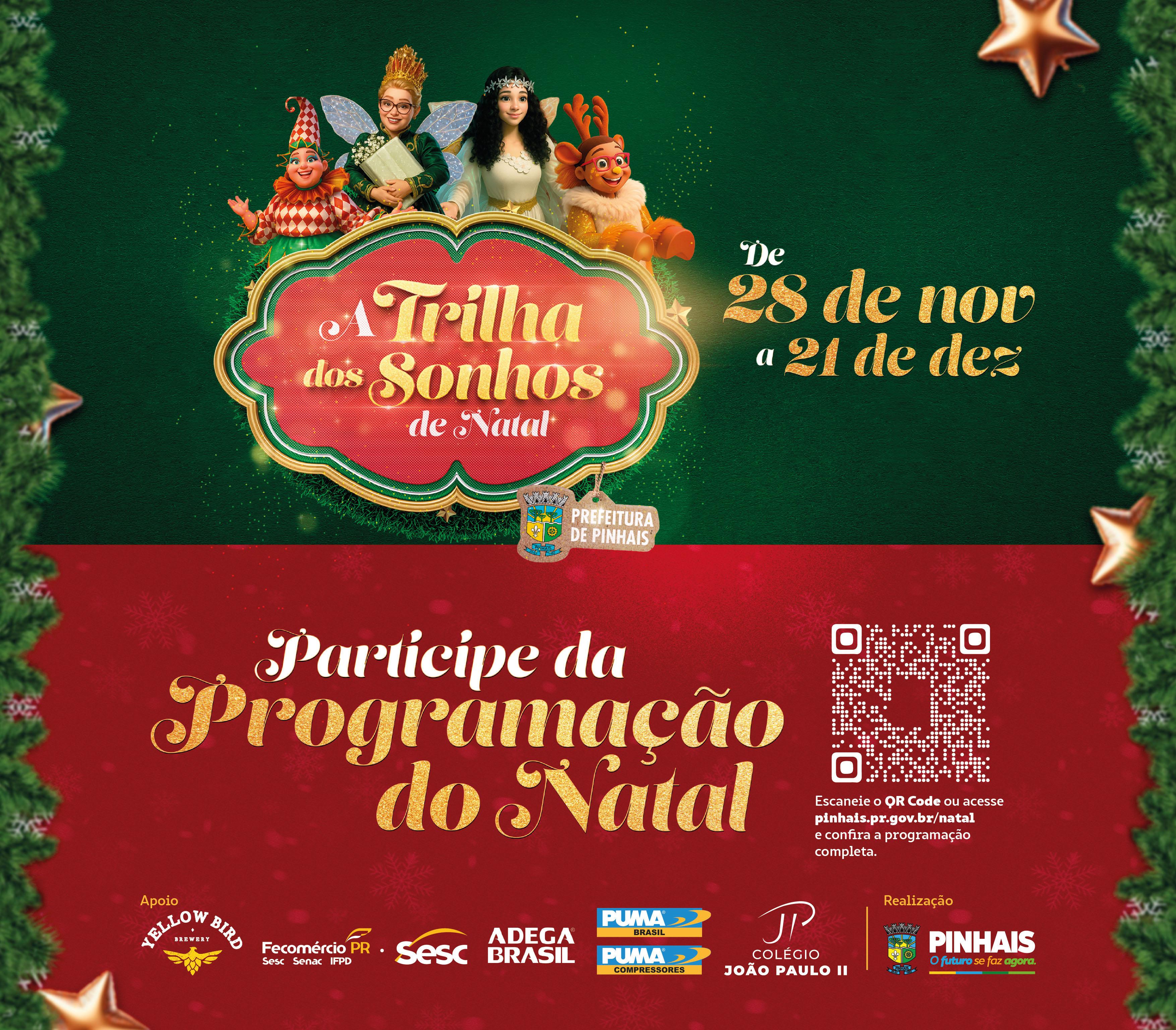 É tempo de Natal! Em Pinhais, a tradicional festa celebrada em diversos lugares do Brasil e do mundo ganha toques especiais. No município, uma programação repleta de atrações culturais convida as famílias para dias e noites inesquecíveis. A Prefeitura de Pinhais apresenta neste ano “A Trilha dos Sonhos de Natal”, com espetáculos teatrais e musicais onde um elenco de personagens conta as histórias desta época do ano, em diferentes capítulos. O calendário de eventos tem início no dia 28 de novembro (sexta-feira), com atrações reservadas para o Parque das Águas, onde haverá a chegada do Papai Noel e o acendimento das luzes de Natal, que também marca os primeiros dias de programação nos bosques do município. A agenda completa de atrações contempla todas as regiões da cidade, incluindo Teatro nos Bairros, Feira de Natal, entre outras, até o dia 21 de dezembro.