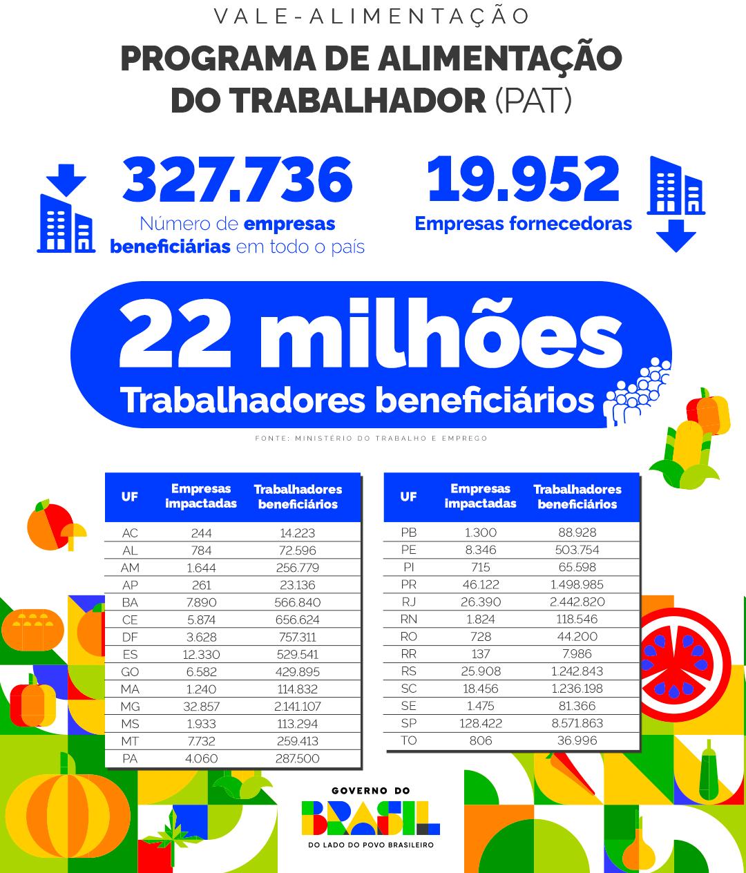Presente nas 27 Unidades da Federação, o PAT reúne atualmente mais de 327,7 mil empresas beneficiárias e 37 mil empresas fornecedoras. Ao todo, são 22,1 milhões de beneficiários.
