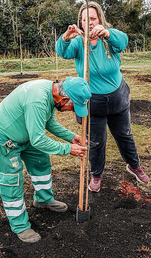tamento, são usadas apenas espécies nativas, selecionadas conforme a área de plantio. “É feita uma avaliação do espaço que a gente tem, se é canteiro, qual o espaço para a raiz, se tem fiação elétrica ou não, para selecionar se é uma árvore de pequeno, médio ou grande porte”, explica. Nas áreas predominantemente urbanas, os técnicos dão preferência a espécies com raiz axial (pivotante), que cresce para baixo, diferentemente das plantas com raíz tabular, que crescem para os lados e disputam lugar com calçadas e outras estruturas. Em eventos comemorativos, como inaugurações de equipamentos públicos, Dia da Árvore ou abertura do 9.º Seminário Metropolitano de Educação Ambiental, a equipe da Semma realiza o plantio de espécies simbólicas, como o pau-brasil, ipês ou araucárias, que são de grande porte e necessitam de uma área especial. As áreas são escolhidas conforme o desenvolvimento da cidade e a necessidade de sombreamento em avenidas já consolidadas. “A gente sempre trabalha em parceria com a Secretaria de Obras. Quando os técnicos terminam de fazer novas ruas e calçadas, passam a atribuição para a Semma realizar o plantio de grama e de árvores. Também temos escolhido algumas avenidas principais que apresentavam pouca arborização, parques lineares e Parque das Águas”, exemplifica a diretora do departamento. Em algumas ações, o plantio é realizado junto com a comunidade do entorno, como forma de envolvê-los com a preservação das mudas, dentro das ações de educação ambiental.