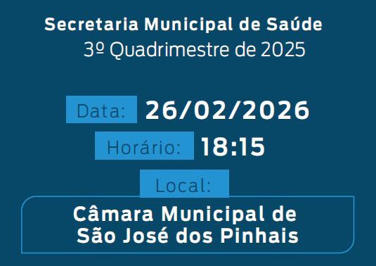 A Secretaria Municipal de Saúde (Sems) de São José dos Pinhais convoca toda a população, membros do Conselho Municipal de Saúde e representantes de entidades públicas para participarem da audiência pública que será realizada no dia 26 de fevereiro, às 18h15, na Câmara de Vereadores O encontro é para expor as ações e prestação de contas referentes ao 3º quadrimestre de 2025. Durante o evento, serão apresentados relatórios sobre indicadores e execução orçamentária da gestão do Sistema Único de Saúde (SUS) no município, e terá transmissão ao vivo pela TV Câmara.