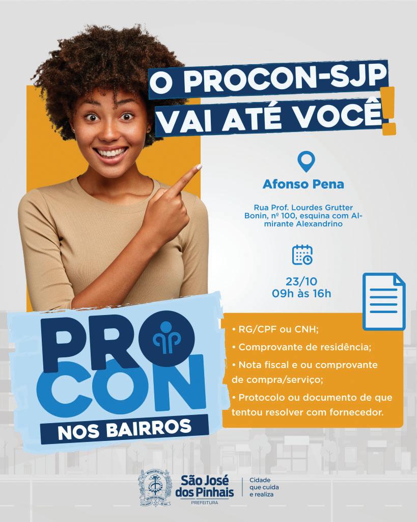 O Procon de São José dos Pinhais, em parceria com a Secretaria Municipal de Governo (Semgov), realiza nesta quinta-feira (23) mais uma edição do projeto Procon nos Bairros. A ação será das 9h às 16h, na Administração Regional Afonso Pena, localizada na Rua Profª Lourdes Gruter Bonin, nº 100, oferecendo orientações e atendimentos diretos à população.