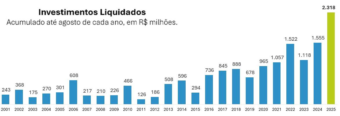 O Paraná registrou R$ 2,3 bilhões em investimentos liquidados até agosto, maior valor da série histórica iniciada em 2001. O resultado é 49% superior a 2024 e 41,7% maior em termos reais. Em relação a 2018, o salto chega a 144%. A gestão estadual destaca que os recursos representam obras e serviços já entregues à população.