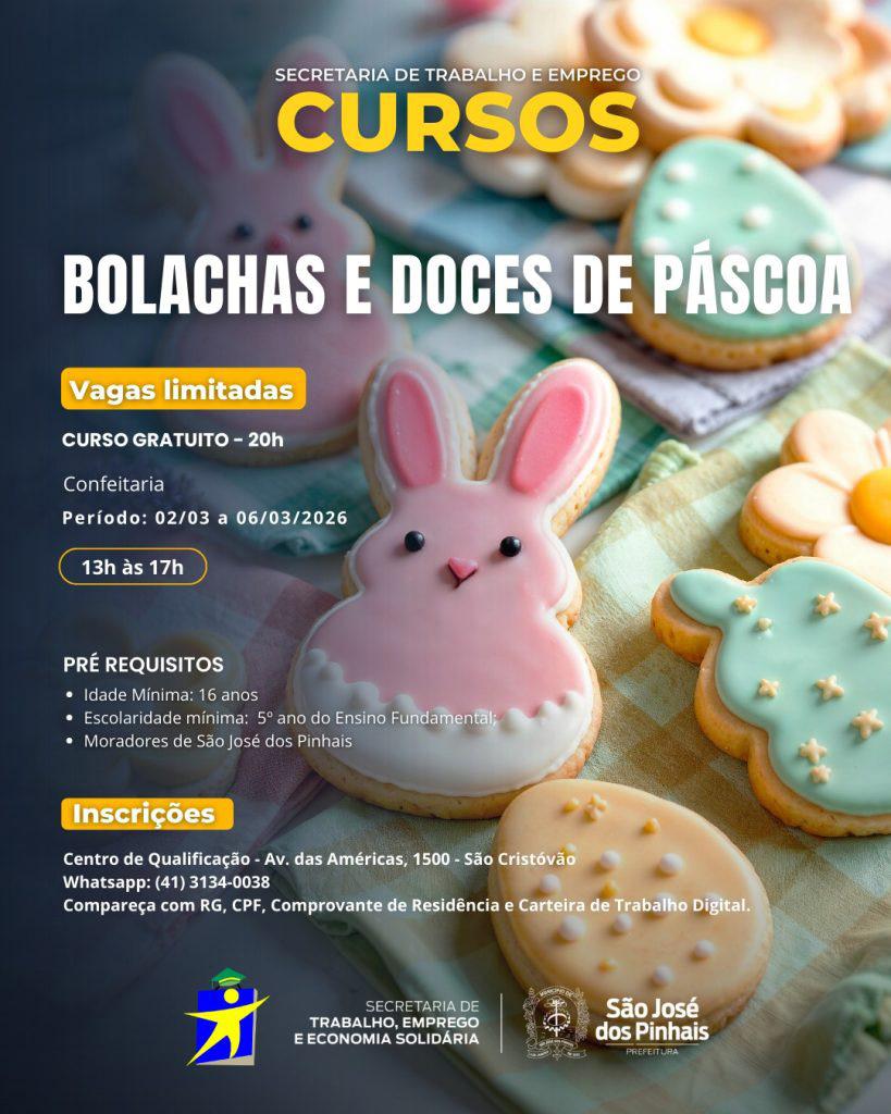 A proximidade da Páscoa também pode representar oportunidade de qualificação e geração de renda: estão abertas as inscrições para o curso gratuito de confecção de bolachas e doces temáticos, promovido pela Secretaria Municipal de Trabalho, Emprego e Economia Solidária (Setrab). A capacitação será realizada entre os dias 2 e 6 de março, com carga horária de 20 horas, nos períodos da manhã (8h às 12h)