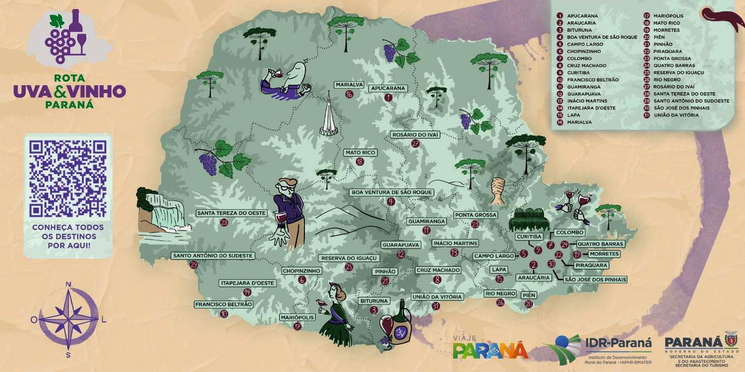 meja consolidar o enoturismo como política de longo prazo e criar um produto turístico que reforce o Paraná como destino para esse tipo de experiência. A organização envolve, além da Seab e do IDR-Paraná, a Associação dos Vitivinicultores do Paraná (Vinopar). Com atividades como o sistema “colha e pague”, participação em vindimas, degustações guiadas e atividades ao ar livre nas propriedades, o projeto promete causar impacto na agroindústria e na diversificação das atividades produtivas das regiões participantes.