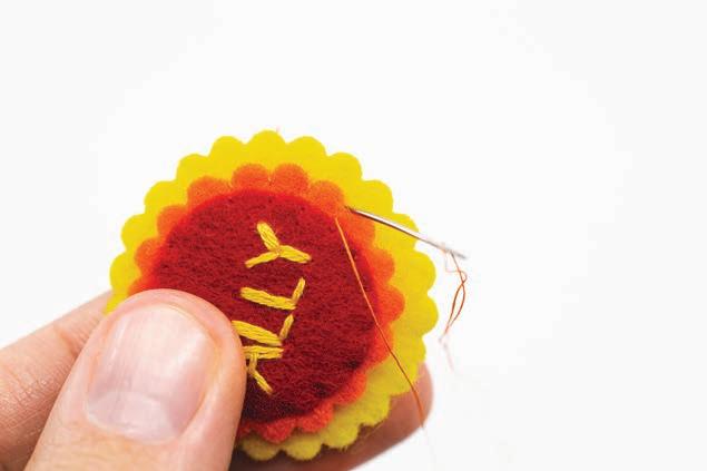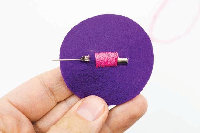 Start by making a few small stitches through the pin back’s holes. Then make a few long stitches across the pin back. Go around a few times to secure the pin.