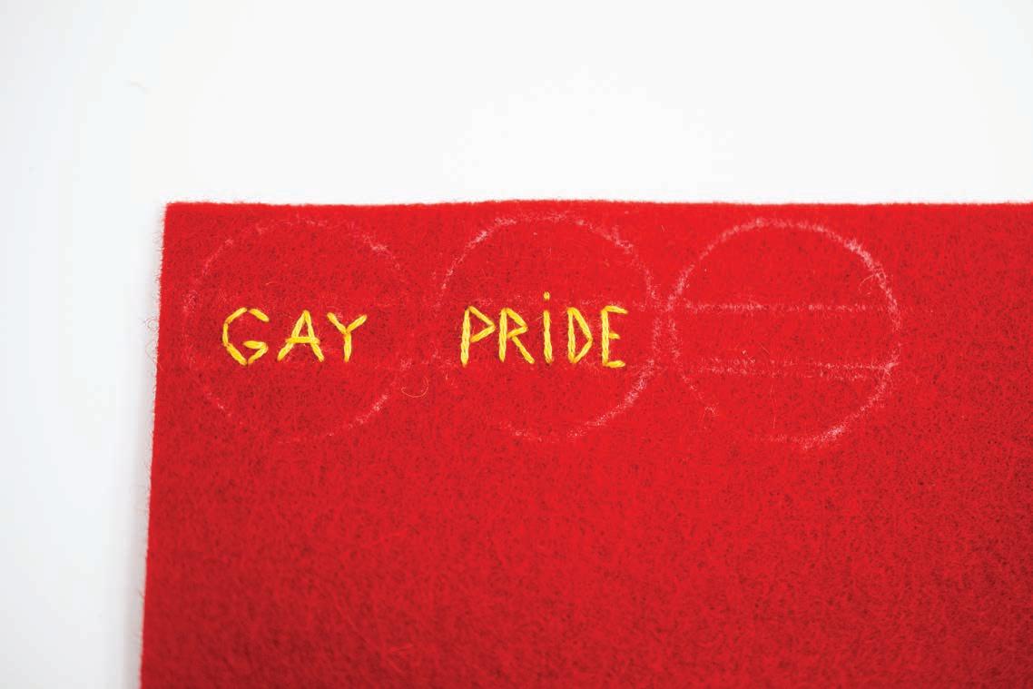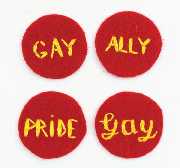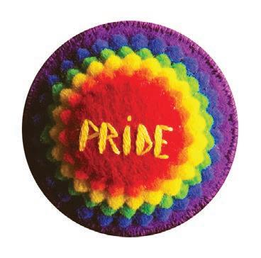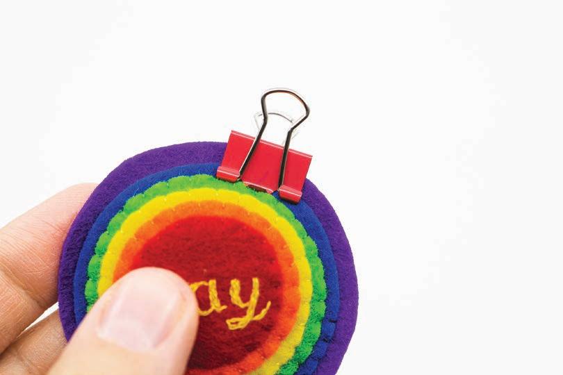 Stitch red, orange, yellow, green, blue and purple pieces together. You will have one purple piece with a pin back and the rest of them stitched together.
