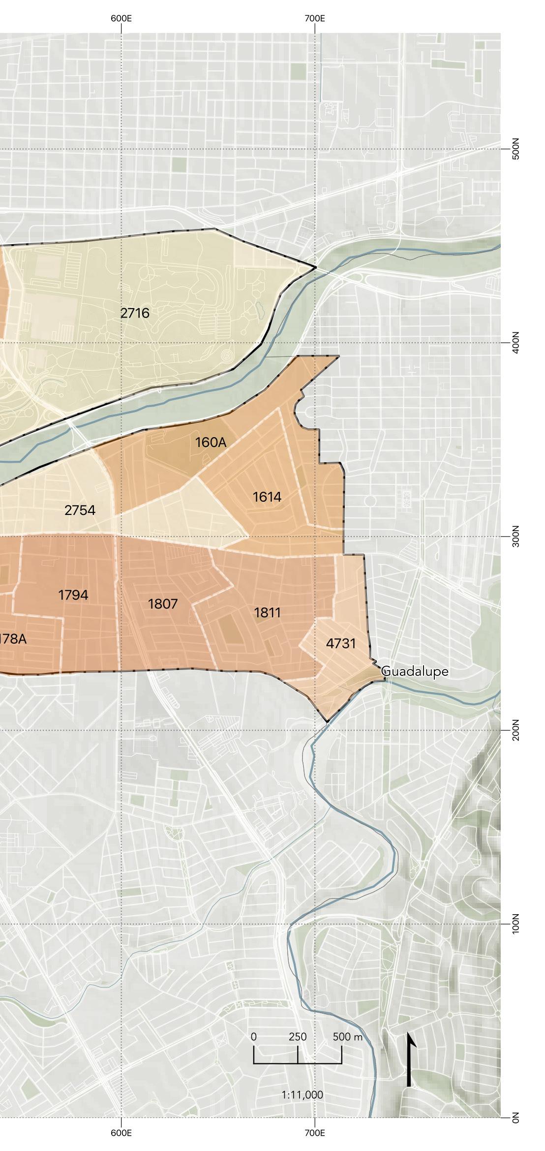 The study zone contemplates 56 neighborhoods, still, the Centro neighborhood distinguishes itself because of its extension with 668 ha, in a contrast with the second biggest which is the Independencia neighborhood with 217 ha, more than 3 times its territorial extension. Even though this is a kind of delimitation, there are also other kinds of separation, for example, political by the electoral federal districts (see maps 1 through 4 on the next page) whose purpose is mainly for the elections, urban by AGEBS (map 2) which is the basic geostatistical area and postal codes (map 3), this is and were used mainly for the facilitation of deliveries.