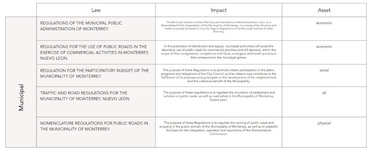 The tables above showed the relationship between the different legal systems (international, federal, state and municipal) and their impact on downtown Monterrey, as well as the law’s asset. These assets are categorized in four branches: social, economic, cultural, physical and environmental.