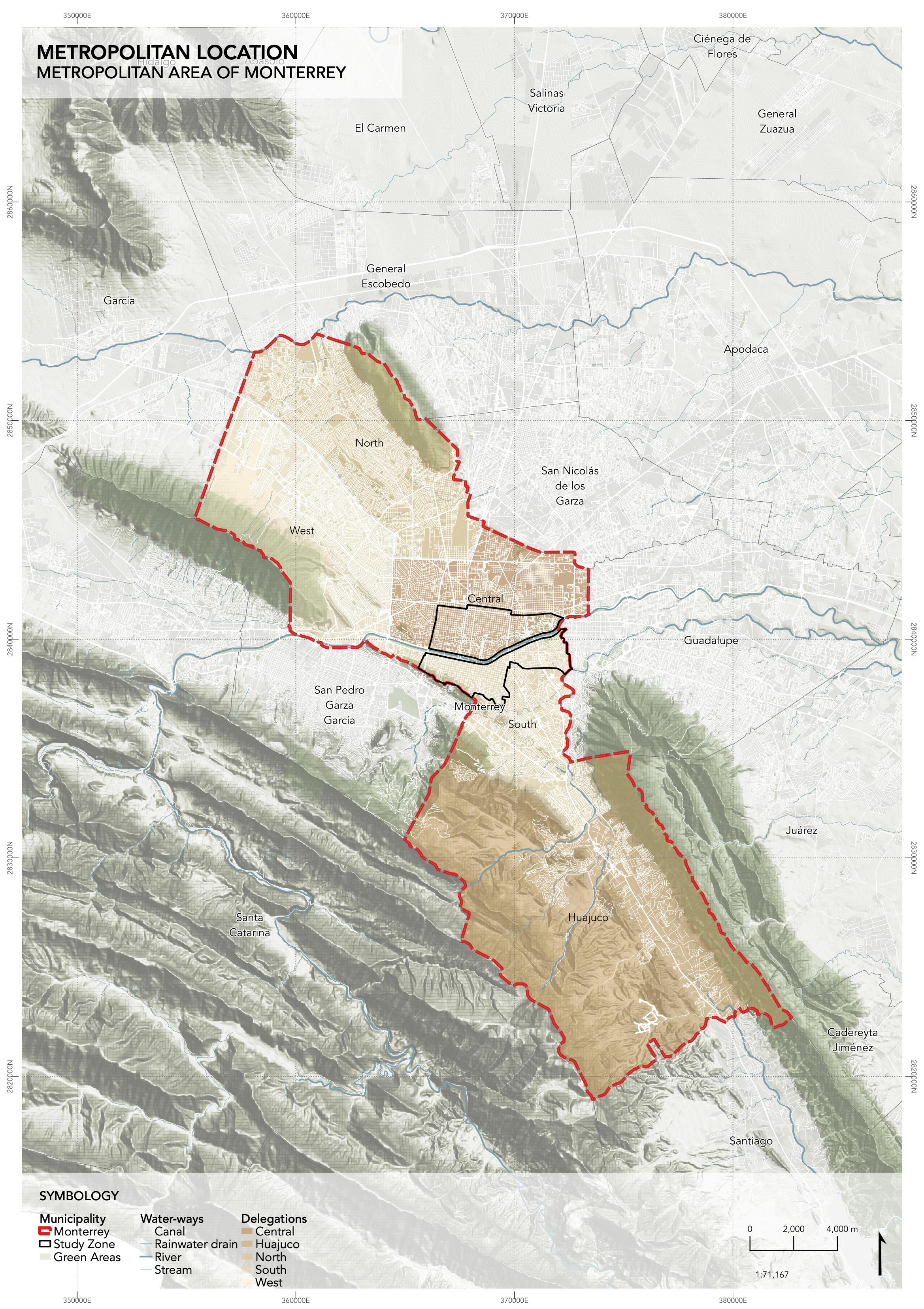 The municipality of Monterrey has 33,899.85 ha and is divided into delegations as a result of the pattern of populations settlements and physical structure of the municipality. These delegations are Central, North, West, South, and Huajuco.