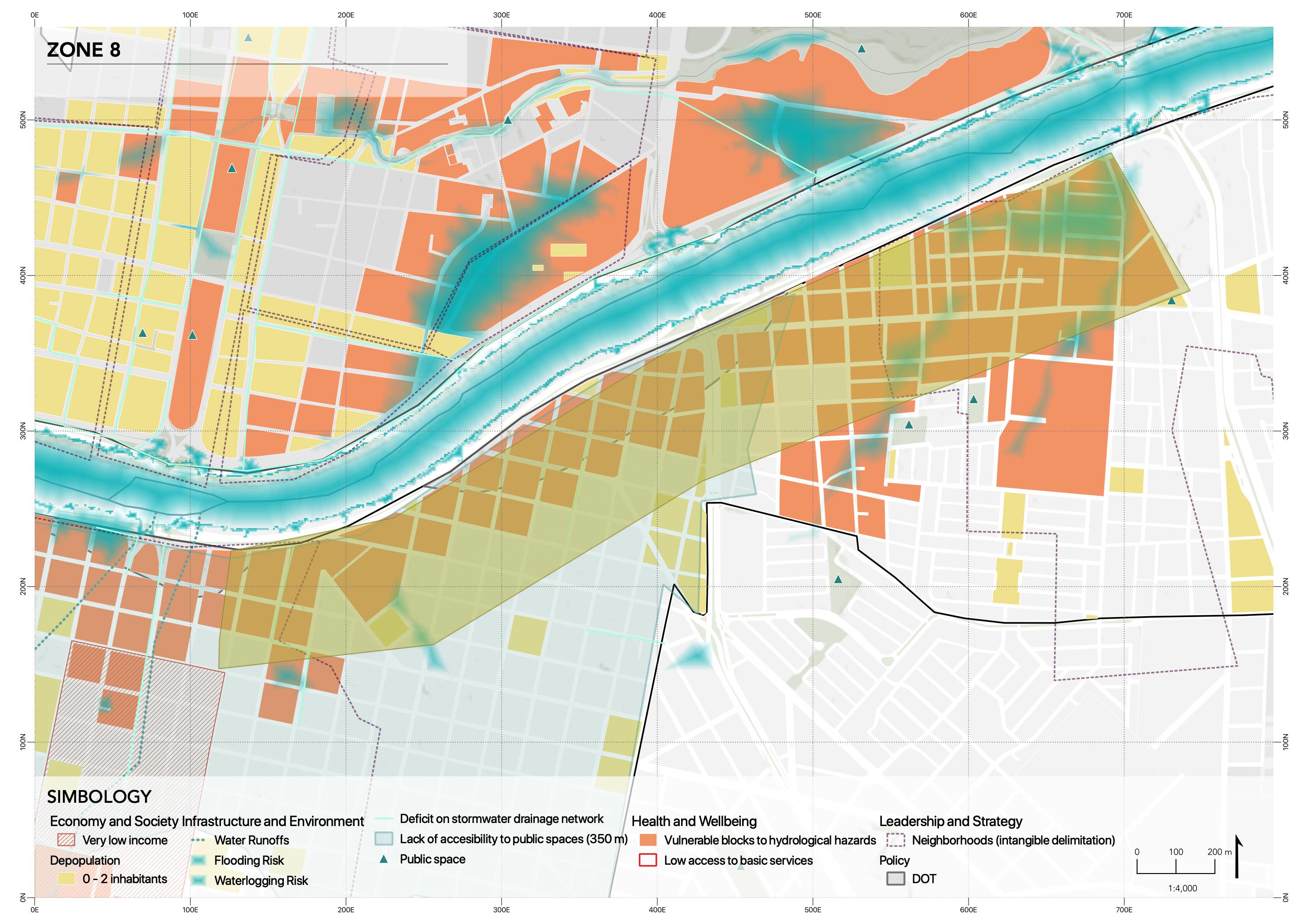 This master plan pretends to increase the resilience of Monterrey’s center through the methodology of the analysis of the current state of the site, a City Resilience Index (CRI), and a Qualitative Risk Assessment, that highlights the 8 strategic zones of the site that need specific interventions, that are aligned