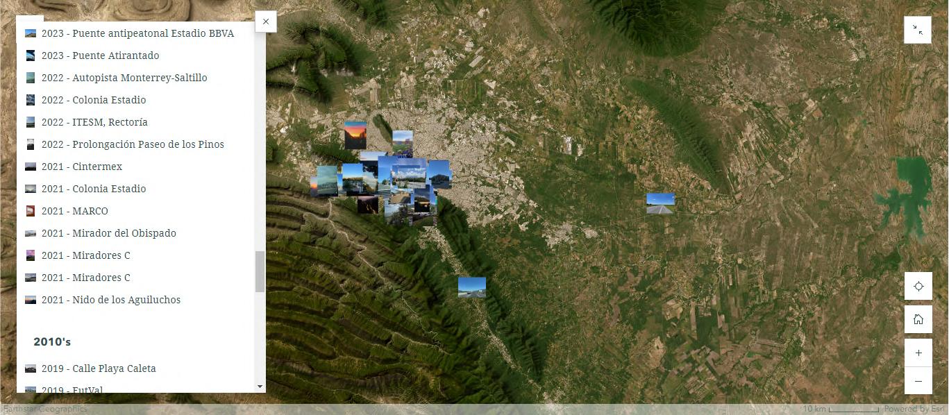 Se desarrolló un mapa interactivo en línea en el que se pueden consultar fotografías del Cerro de la Silla georreferenciadas desde donde fueron tomadas. Se realizó el diseño de imagen para la página web y para la difusión del proyecto, que consiste en postales y publicaciones en redes sociales. Hasta octubre del 2024 el mapa contaba con 124 fotografías distribuidas en ocho décadas diferentes.