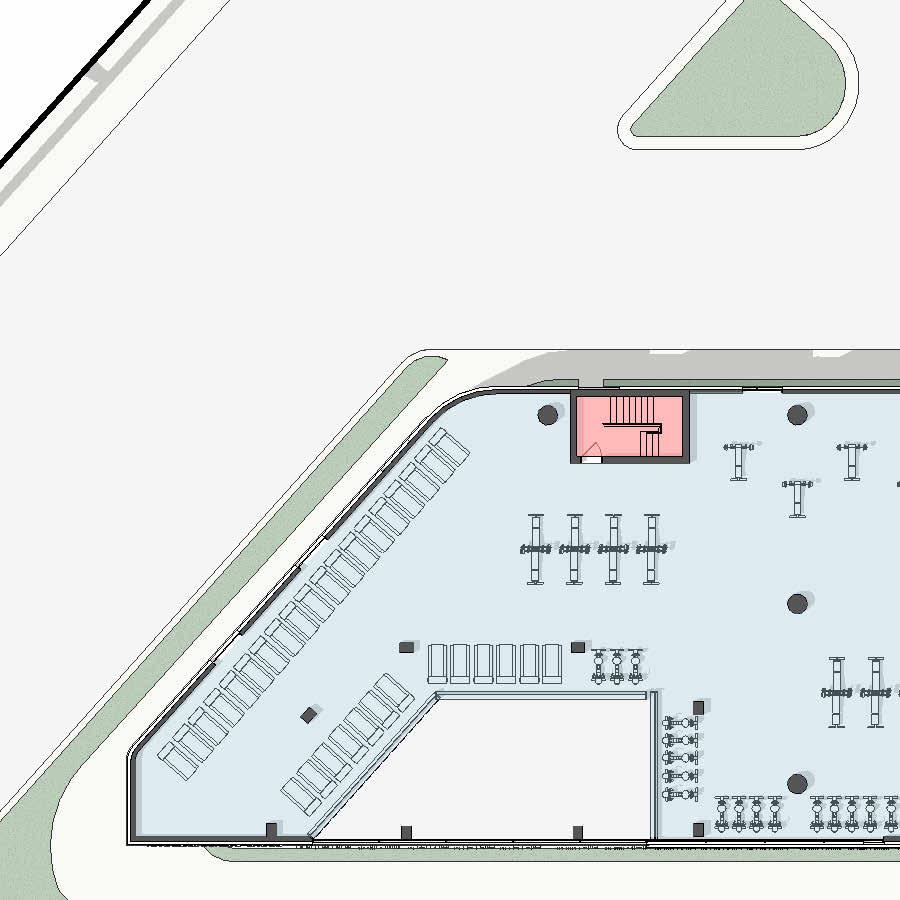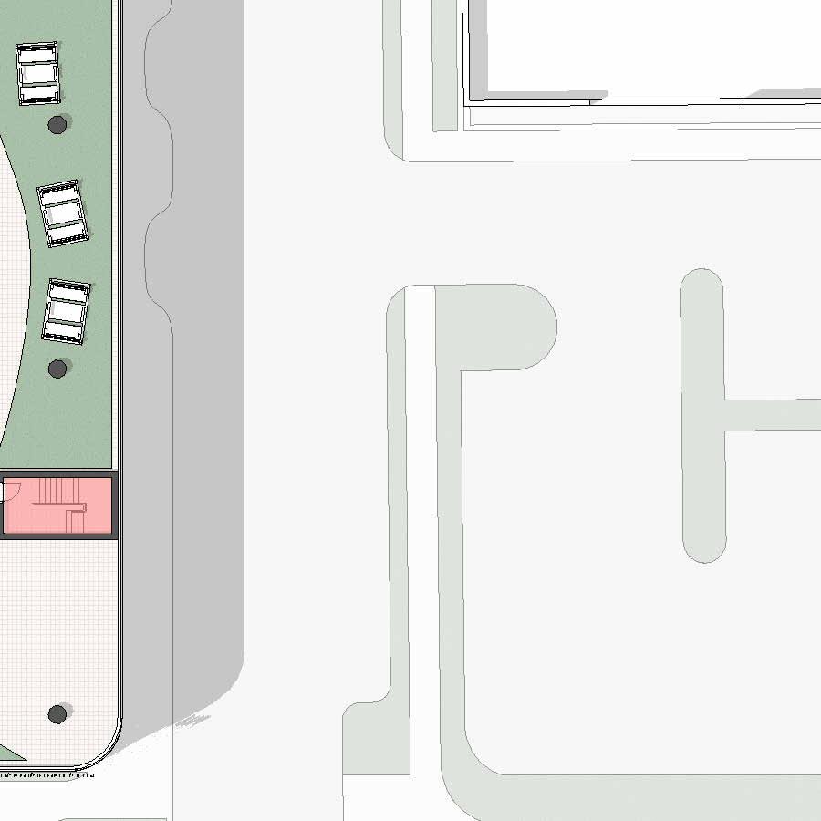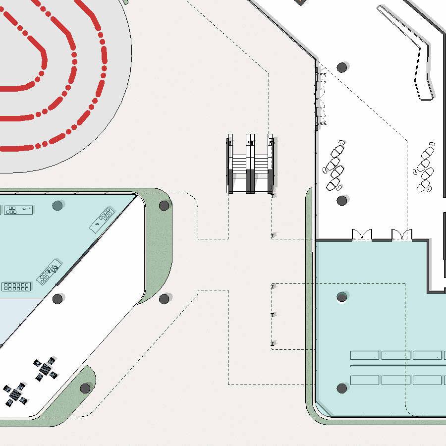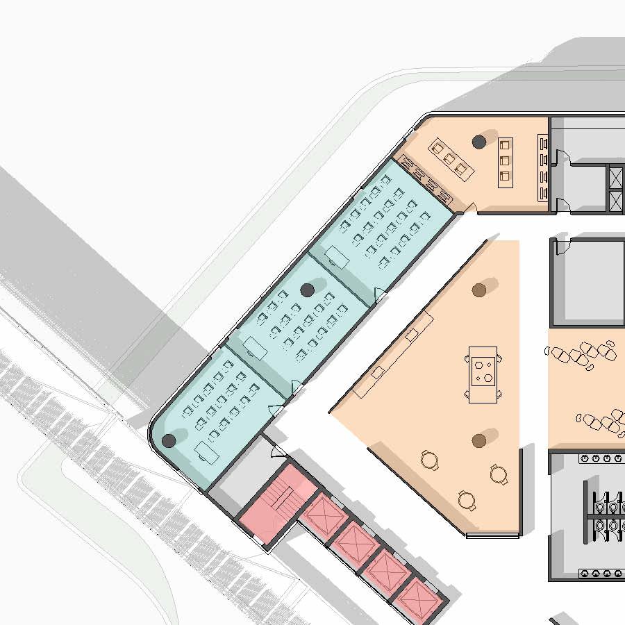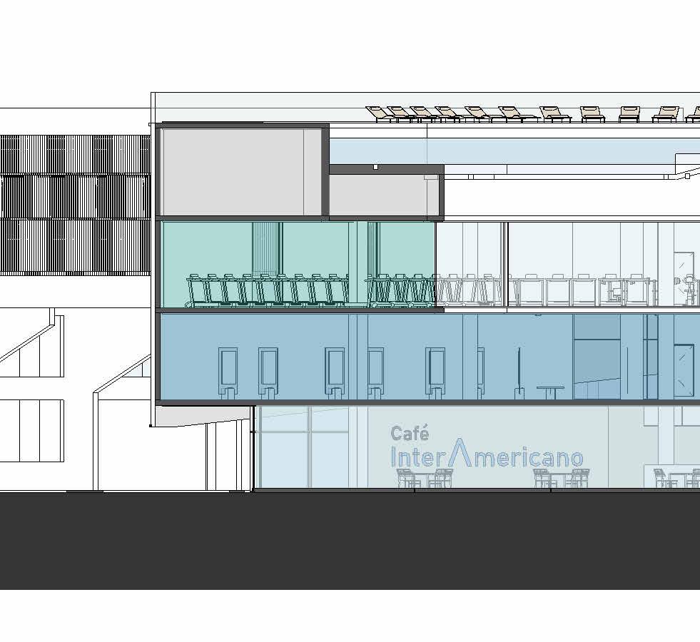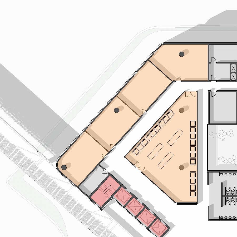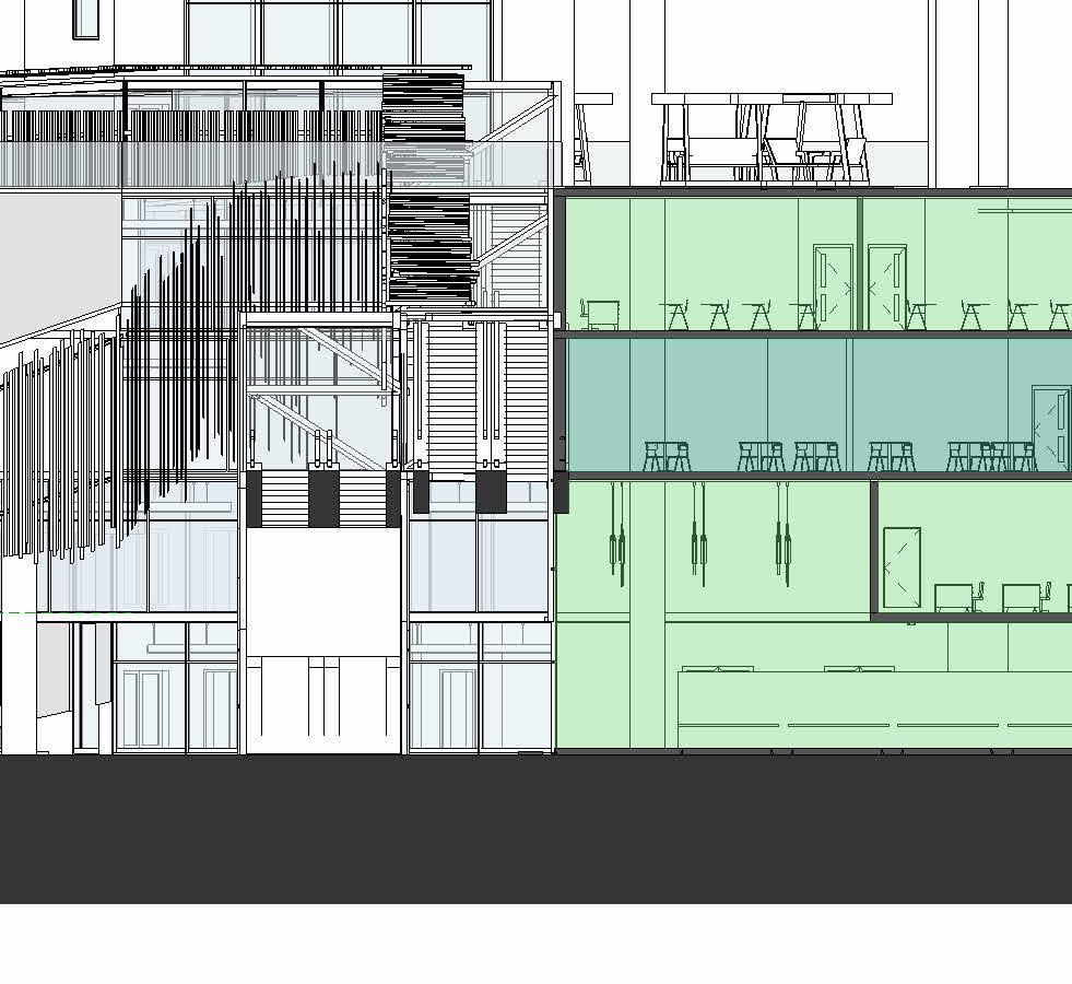 The plaza will include a variety of program open to both the public and studentsincluding a bookstore and café, public art gallery, 8,000 sq-ft. fitness center, and brandnew student housing, accomodating over 320 students.