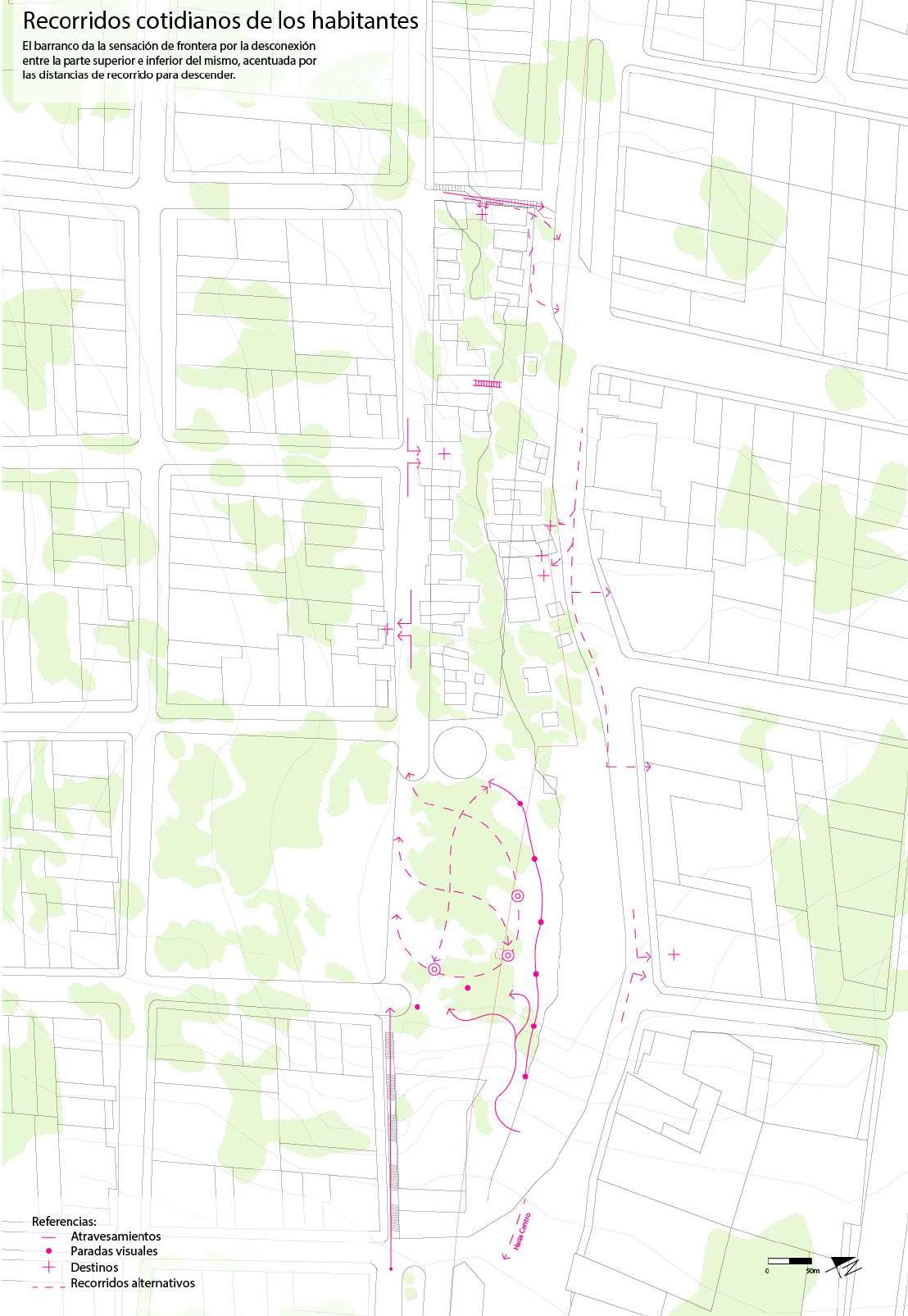 • Reocupación de viviendas disponibles a realojar sobre el barranco y recuperación de terrenos a formar parte del espacio público. Asociado a propuestas de autoconstrucción, subsidio, etc. de hogares para familias que quisiesen reubicarse.