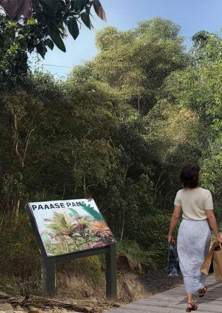 Senderos a nivel de suelo, de madera, con cartelería informativa de flora y fauna local, historia del sitio y del petit pavé. Permiten la circulación continua y accesible entre la vegetación recueprada y el mantenimineto del suelo del cerro.