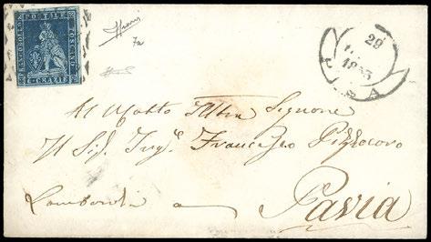 1950 - 5 cent. giallo, I tiratura (1a), tre esemplari, perfetti, applicati per errore al verso, in contrasto con il rEGEOlamento postale, di lettera da Venezia 20/8/1850 a Busco, Oderzo. Insieme interessante e raro. A.Diena, Colla. Cat. ! 14.250++