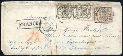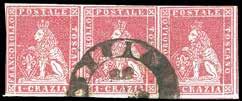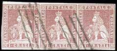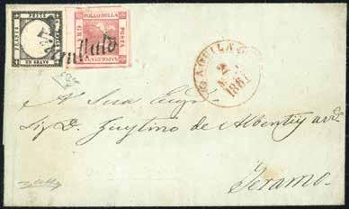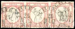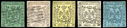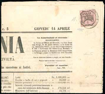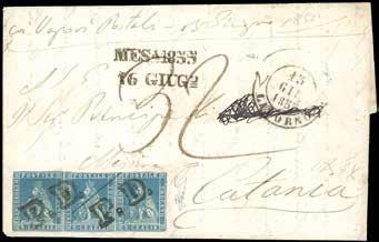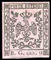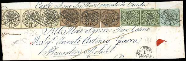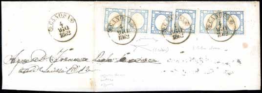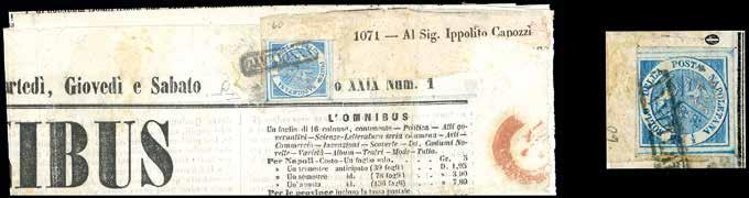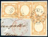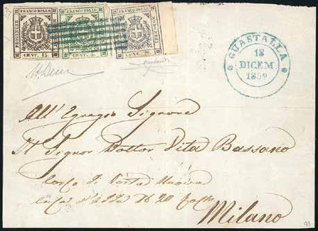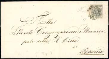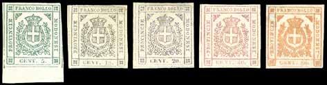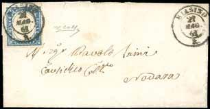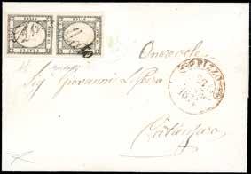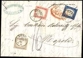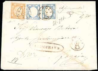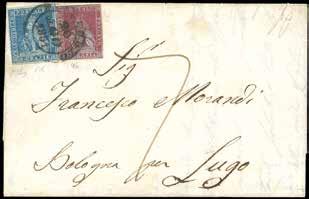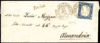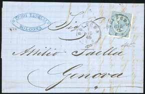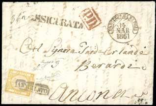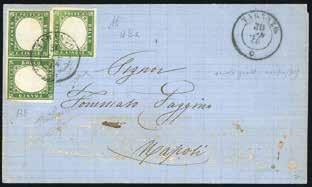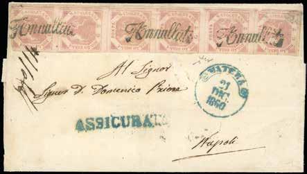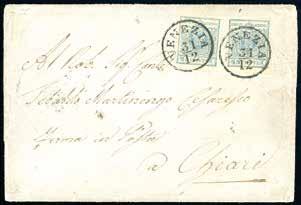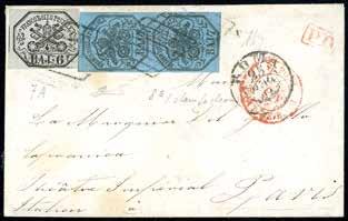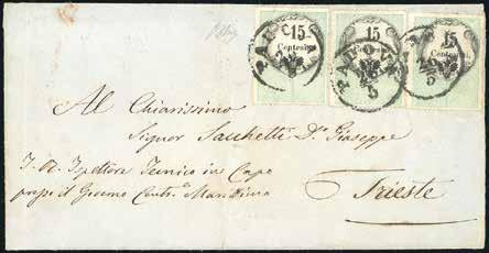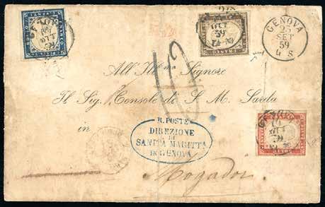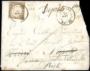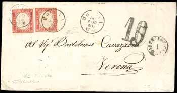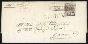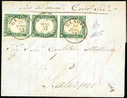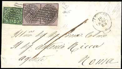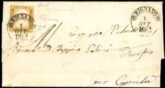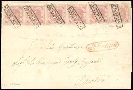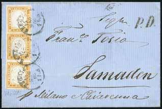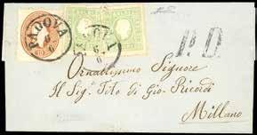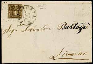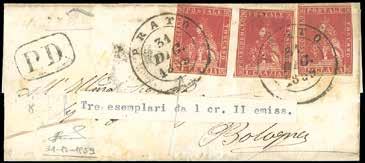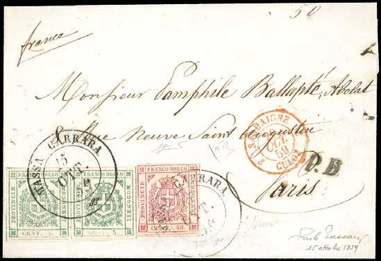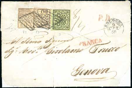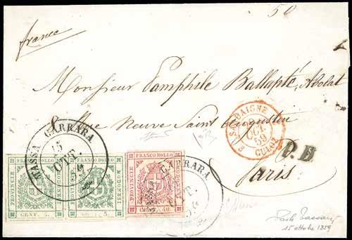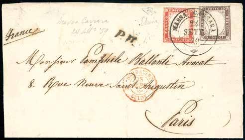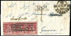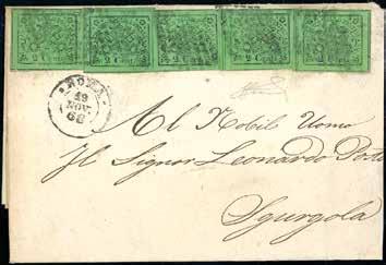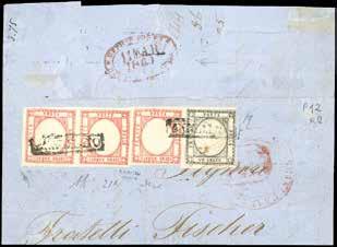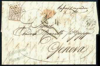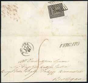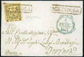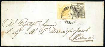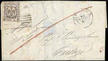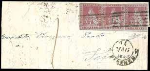 E’ la MASSIMA AFFRANCATURA NOTA del raro francobollo da 1 lira, una delle più importanti e spettacolari lettere del Ducato di Modena. Da esposizione.