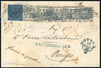 MODENA-FRANCIA 1855 - 1 lira bianco, cinque esemplari, 40 cent. azzurro scu ro (11,10), su sovracoperta di lettera raccomandata di tre porti per 5,40 lire da Modena 28/5/1855 a Parigi.