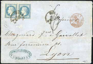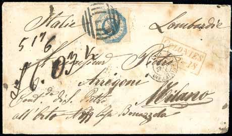 LOMBARDO VENETO-VICTORIA 5 June 1856 - Double-rate letter (1/2-1 ounce) from Melbourne to Milan, 1 s (Yv. 7) lightly short on the left, only to the U.K. then considered unpaid.