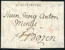 TIROLO AUSTRIACO-IMPERO RUSSO 1795 Lettera preflatelica da San Pietro burgo 16/2/1795 a Bolzano, segno di tassa in sanguigna 8 sul fronte. Molto rara, probabilmente unica. Chiavarello. Ex coll. Imperato.